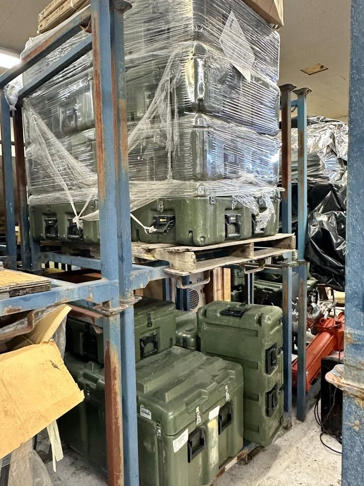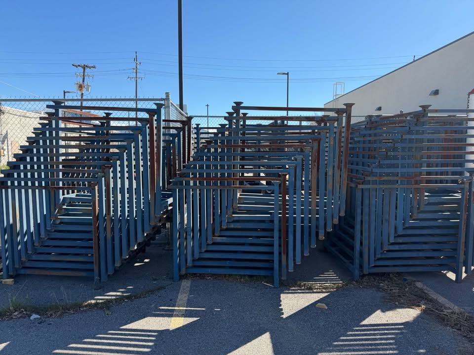 ZelleThese are used 10-gauge steel, heavy-duty storage racks. No assembly required. Can stack up to 6 on top of each other. Perfect for construction sites, warehouses, lumberyards, and more. They can easily be moved by forklift and fit pallets nicely. The dimensions are 48x48x48 and they have a 4k pound capacity. Each rack weighs 136lbs.