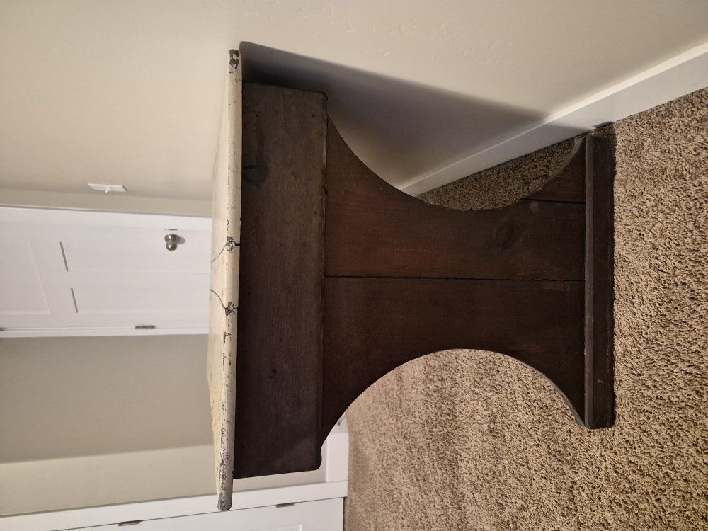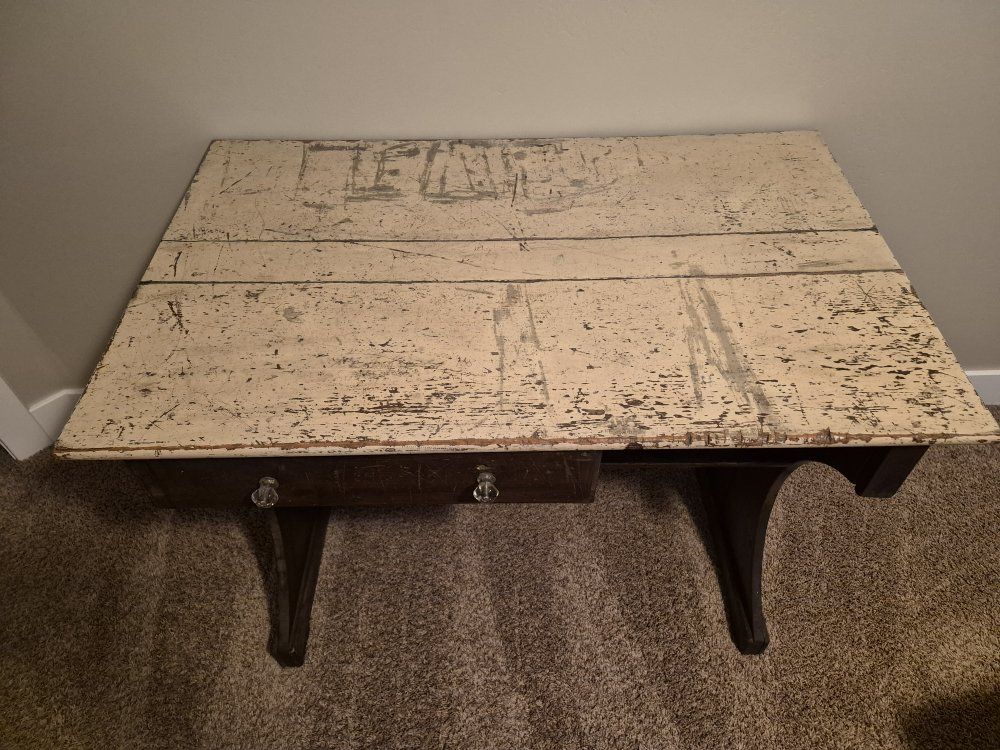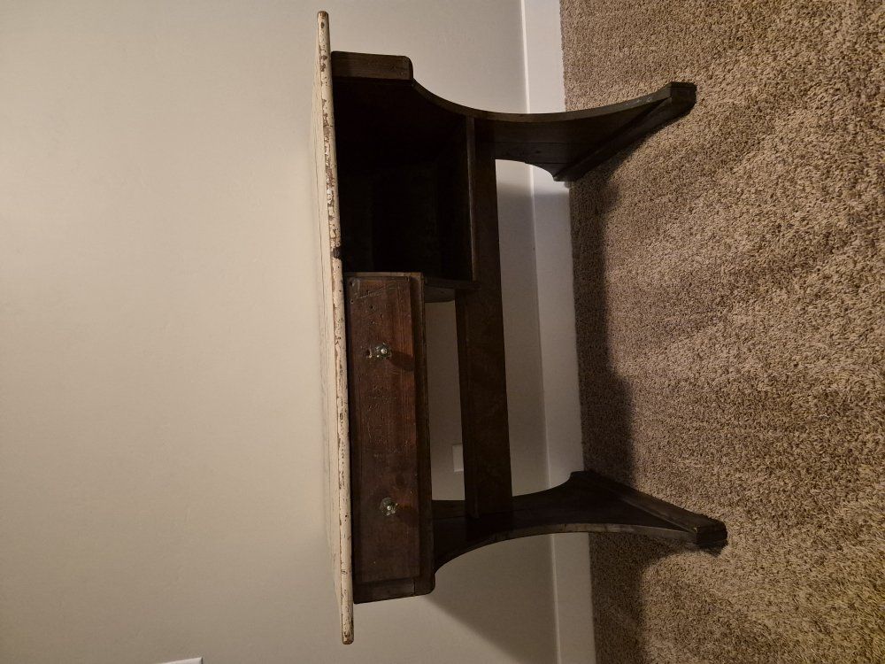Beautiful antique wood desk with tons of character. This is a sturdy, solid piece with a dark wood base and a cream/beige distressed top. It features elegant curved legs, a functional drawer with glass knobs, and a built-in open shelf for extra storage. Perfect as a dedicated workspace, a vanity, or a statement entryway piece. It has a wonderful "chippy" patina that gives it a genuine vintage feel, but the structure is very sound and ready for use. Dimensions: Width: 41.5" Depth: 26.5" Height: 30.5" Price: $140 OBO Location: Vineyard (Pick-up only)