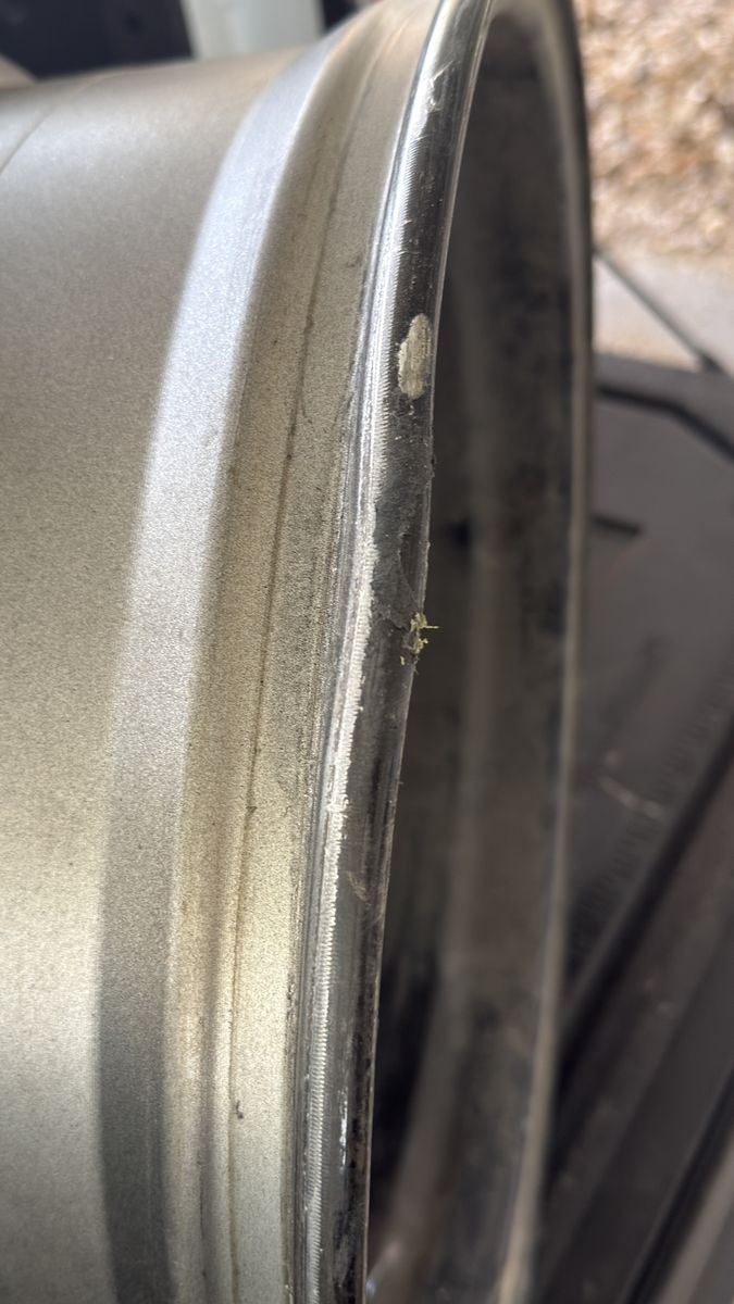 They are all scratched a bit. Two of them have a bend on the edge from hitting a rogue trench plate on the freeway. The other two are just scratched a little. They still hold air despite the damage. I was quoted $100 each to fix the bend but I'm trying to sell them off as is for cheap. Will negotiate.