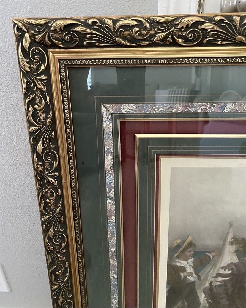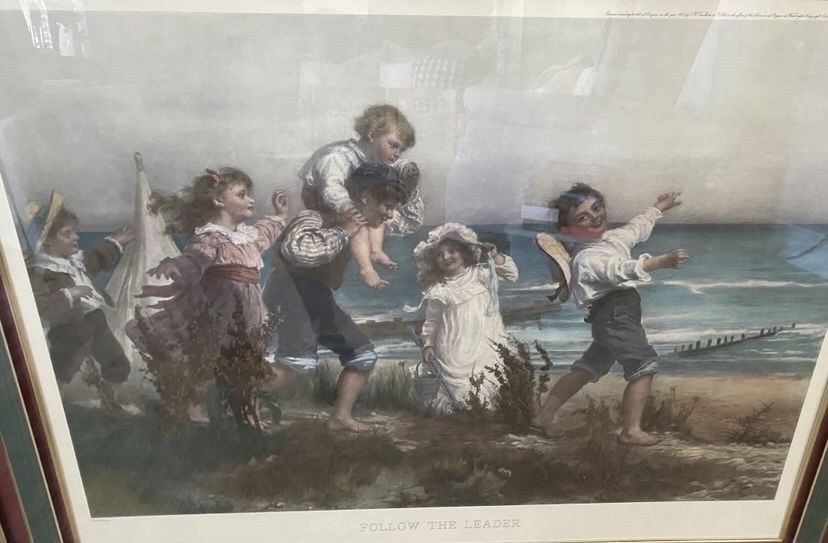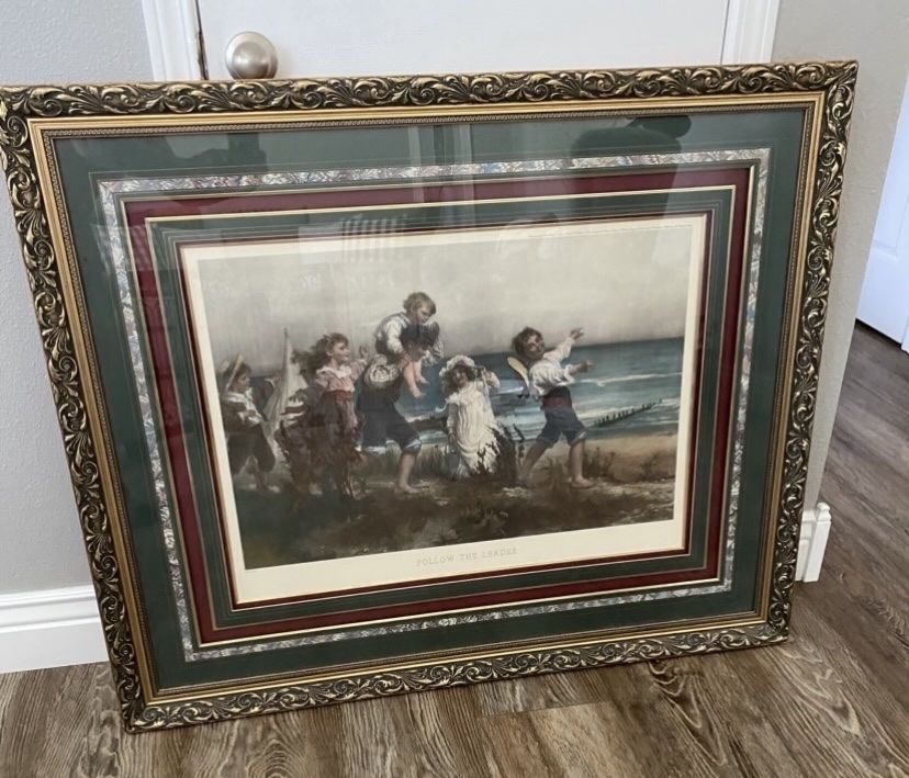 Follow The Leader, by: Fred Morgan, Victorian children on a beach. Framed & Matted, Signed by Fred Morgan in print on the lower left. ** Marked on the upper right margin: Entered according to Act of Congress in the year 1907, by C.W. Faulkner and Co. Ltd. Printed in Vienna. Smoke free home.