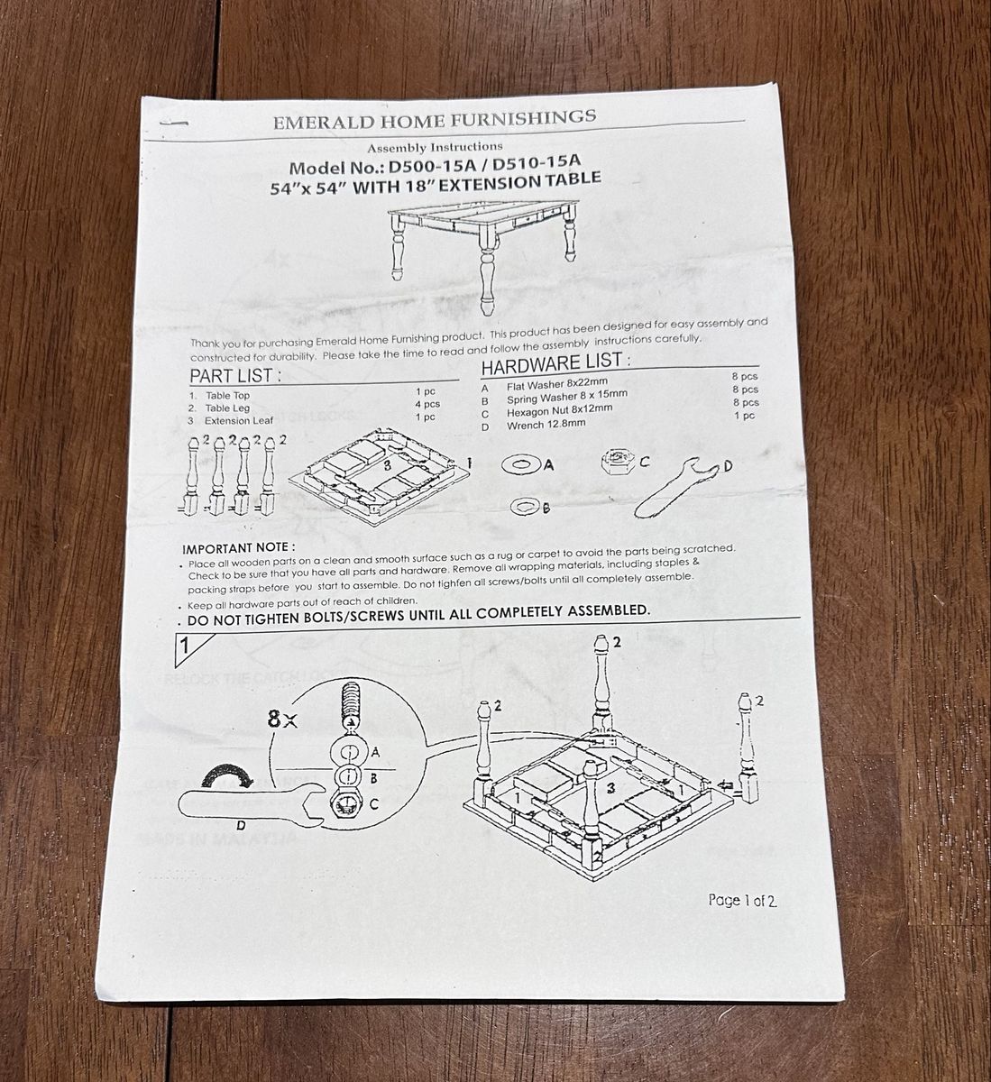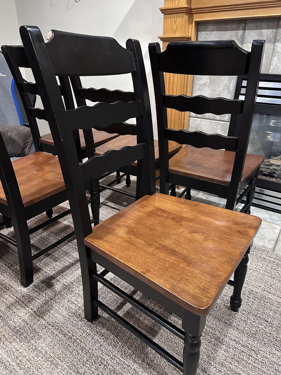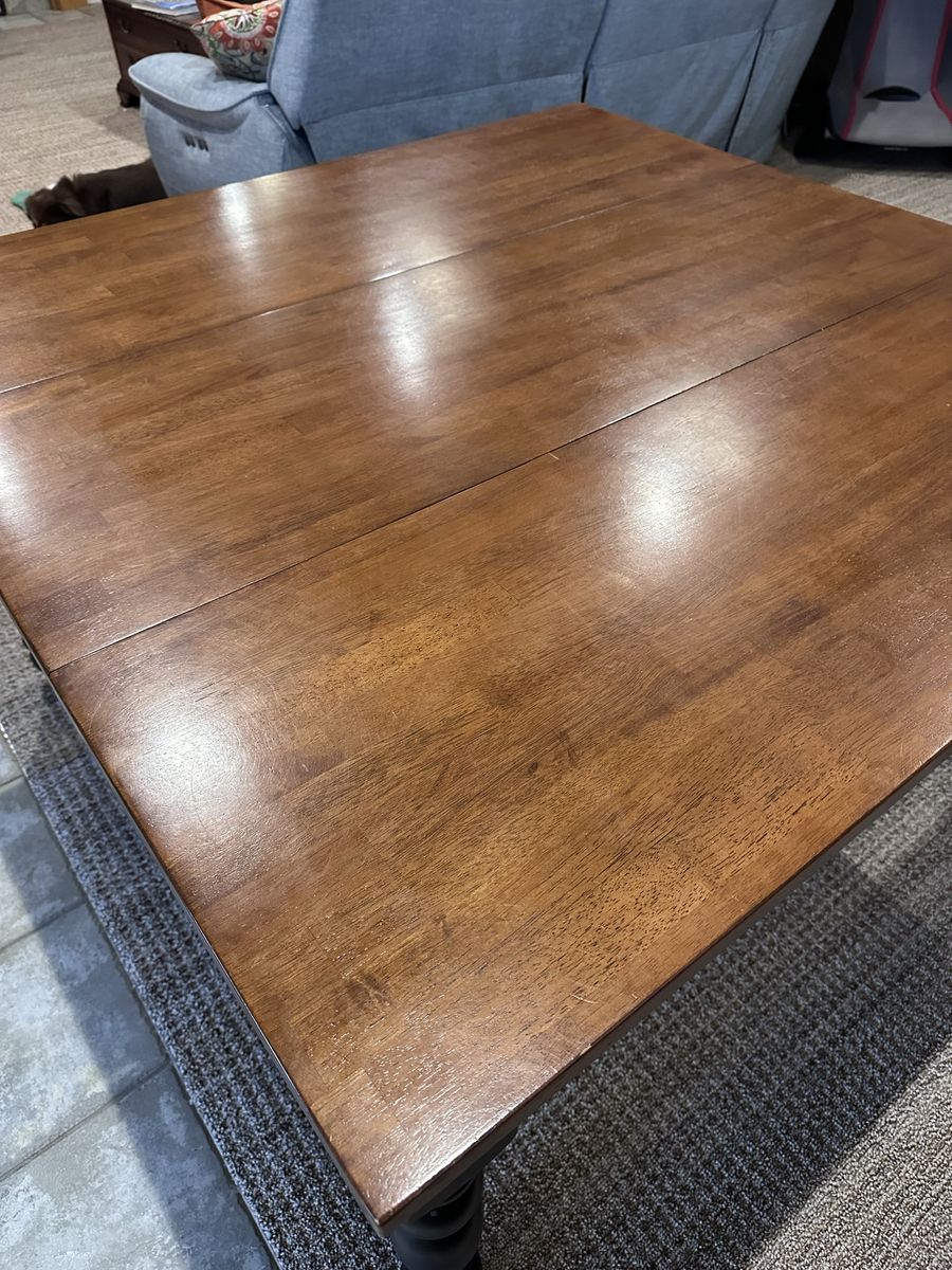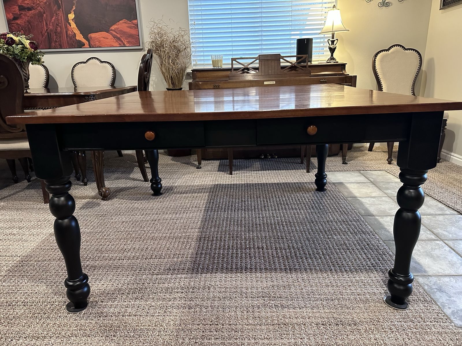 Beautiful wood table with black legs. Expands with 1 leaf to seat up to 8. This has been a great family game table. It has 4 small drawers. Comes with 8 chairs.
