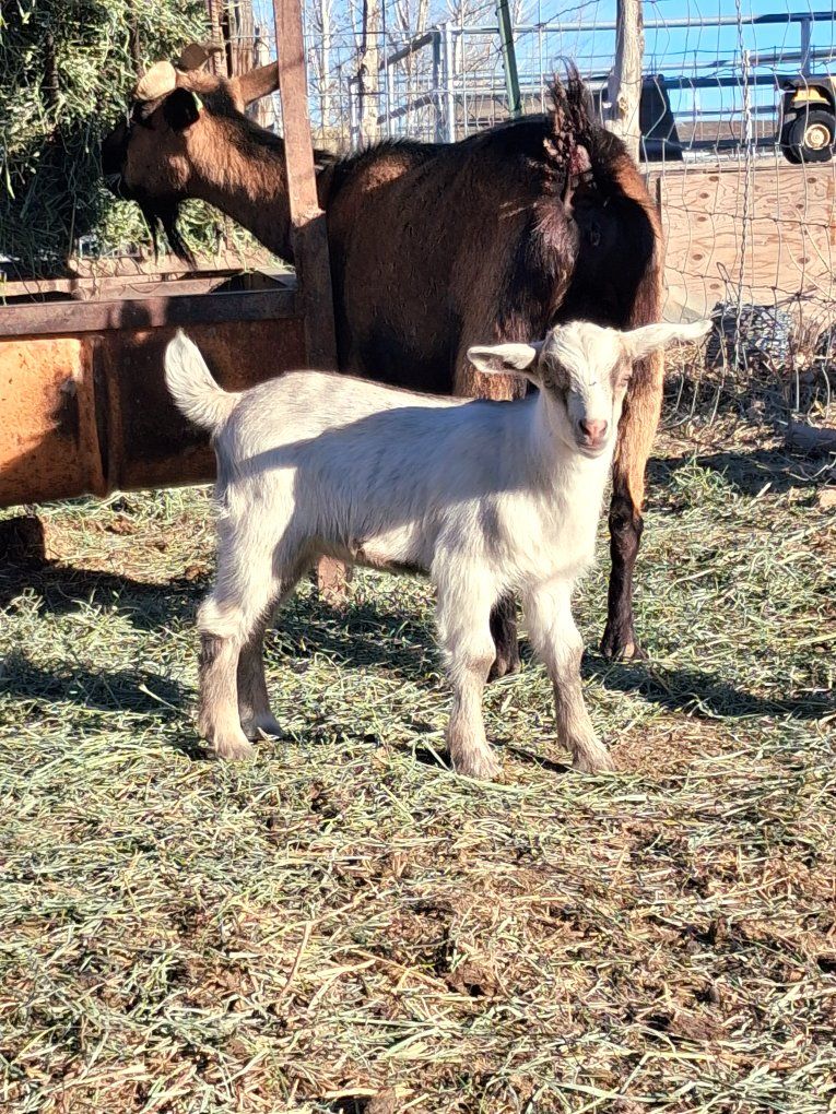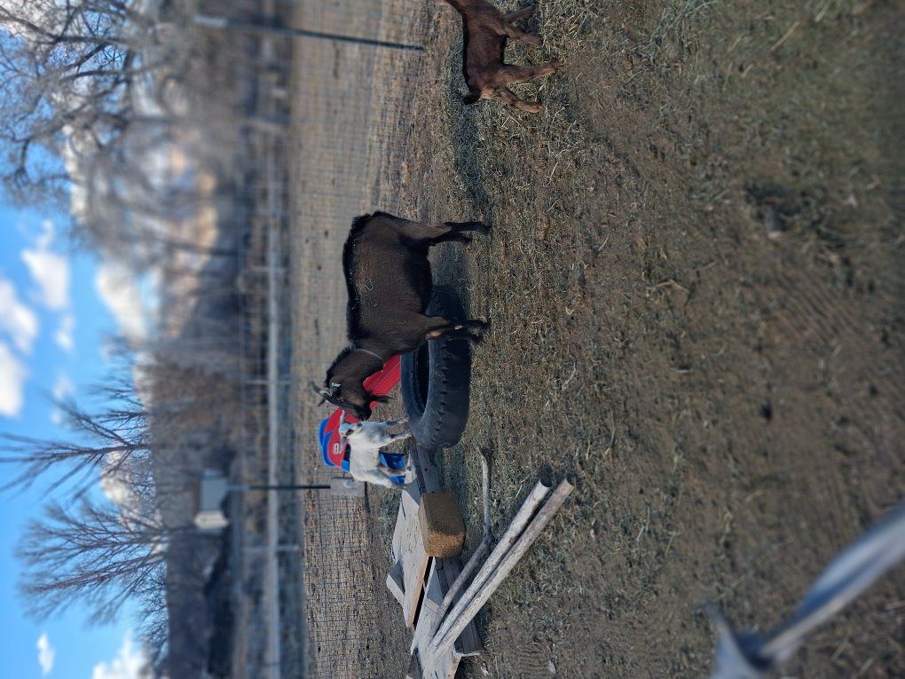 Oberhasli Cross Goats Momma in milk and her baby doeling. We would love for them to go together. Momma is very sweet and I have hand milked her a few times. She was a little rough in the beginning but she is warming up to it. Her doeling is named Tinkerbell- because she is a little more timid and shy. But she is a very sweet girl and has been well handled by our kiddos. $150 for both together, located in Orangeville.