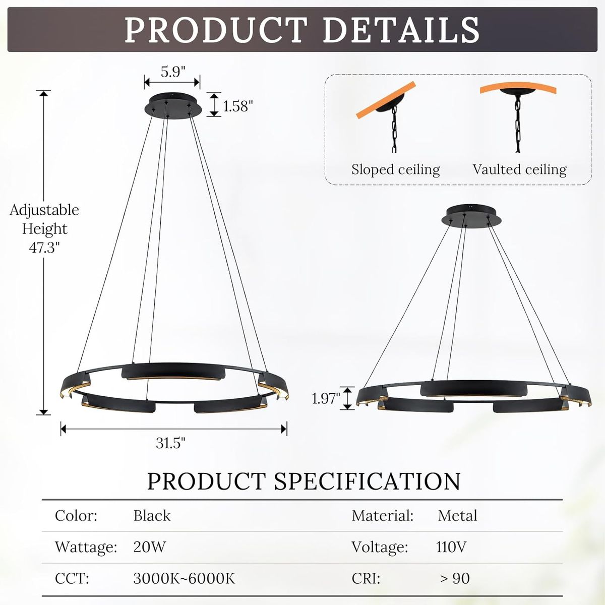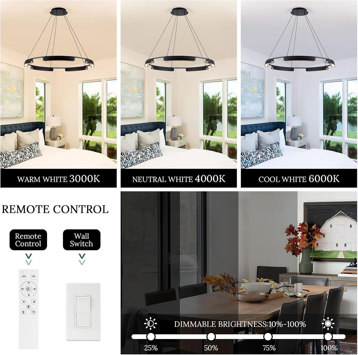 ApplePayModern Black LED Chandelier with Remote Control, 31.5" 20W 3-Color Temperature Dimmable Living Room Chandelier, Hanging Adjustable Ceiling Light for Dining Room Kitchen Island Bedroom