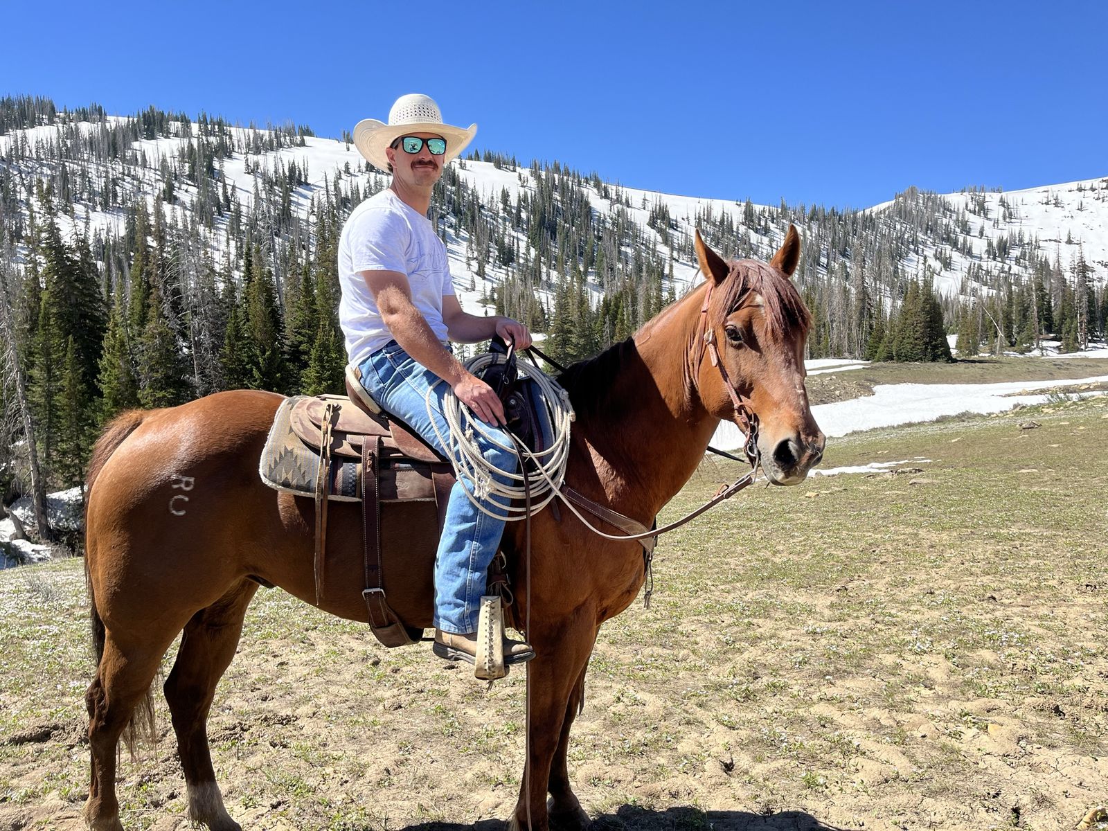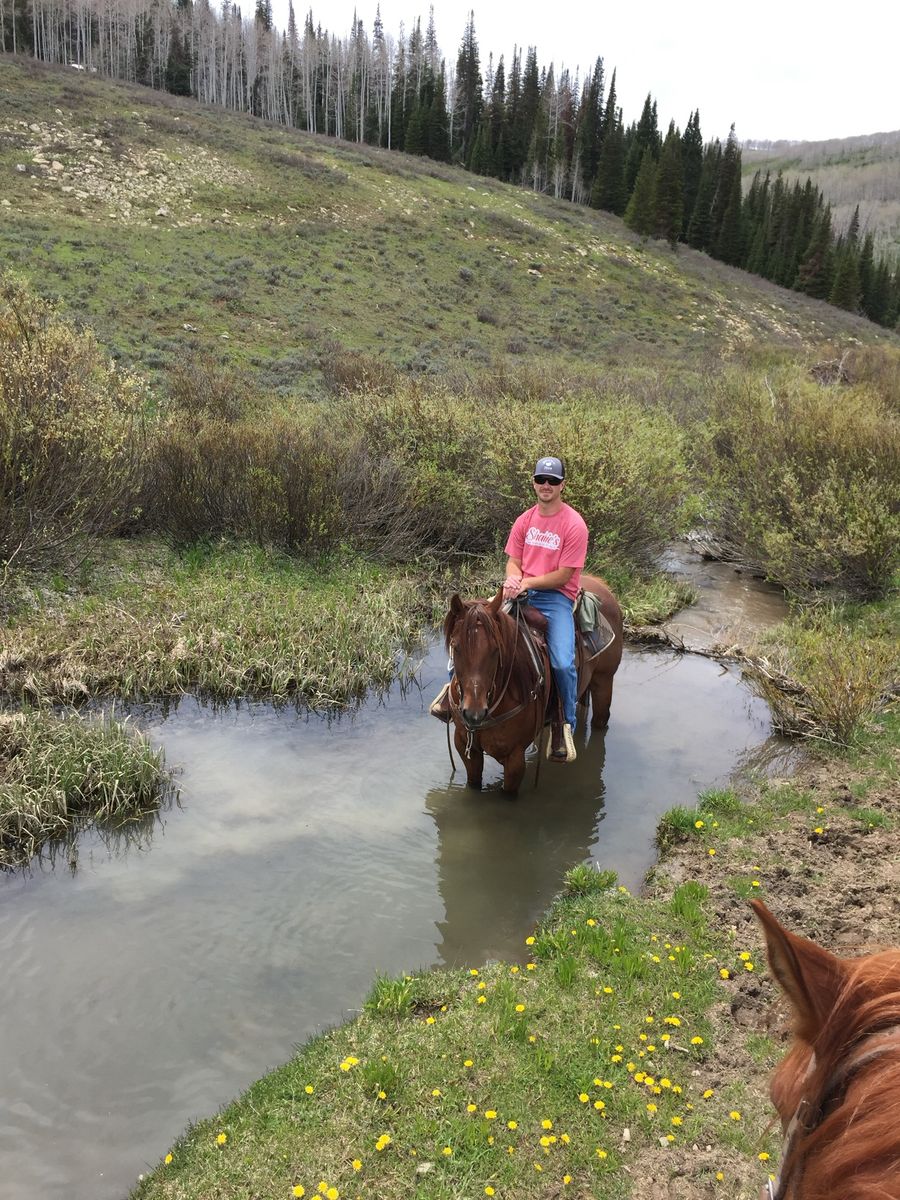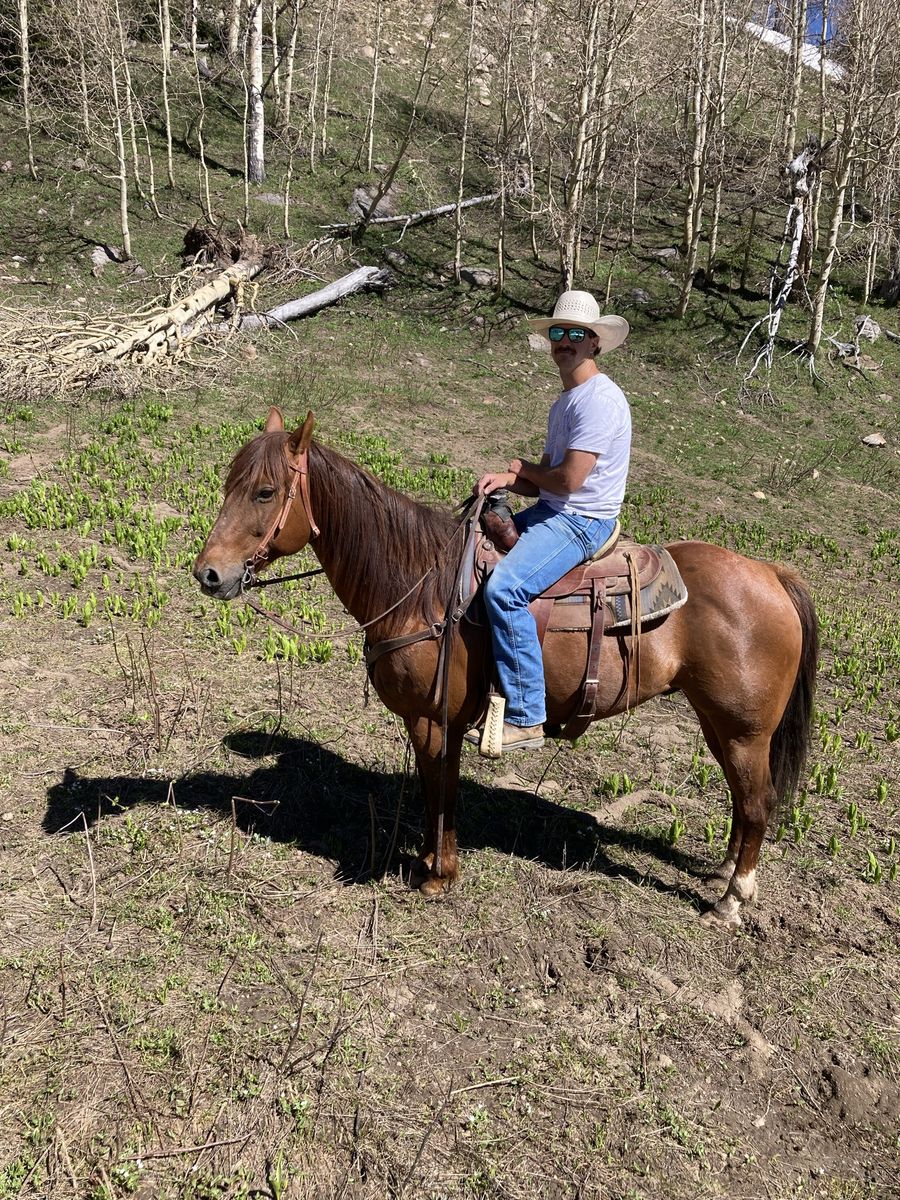 This is an awesome horse. He has had a lot of time on him trail riding in the mountains leading pack horses, no problem crossing rivers and streams. I have branded lots of calves on him he is a started heel horse, I have roped the dummy as well as steers out of the box. My brother had him cowboying on a ranch roping and doctoring cows. My wife has rode him moving cows. He is a solid horse I have had him for 8 years only selling because my wife and I are having a baby I have other pictures and videos I can send you.