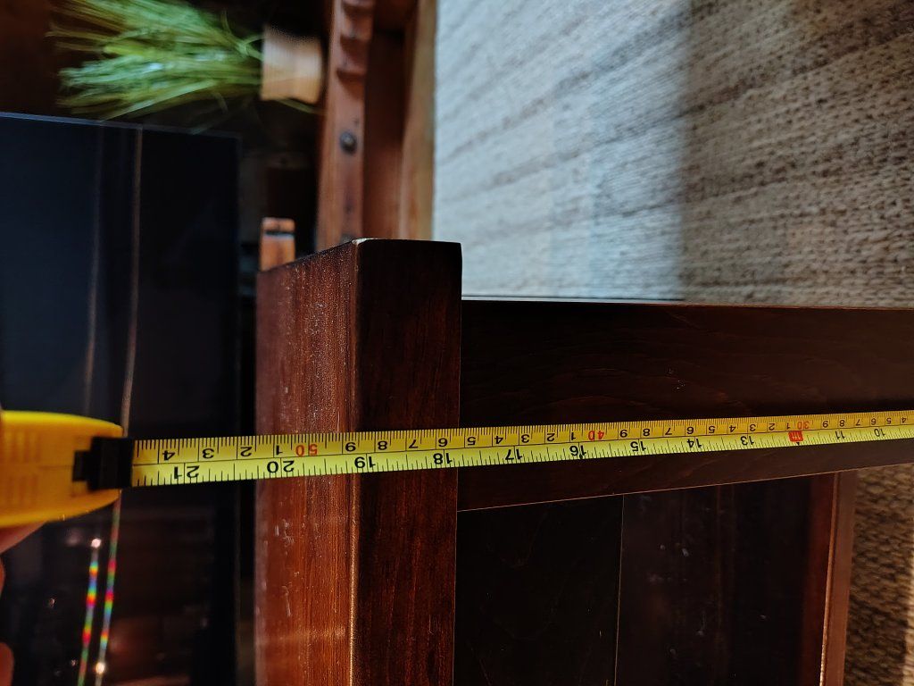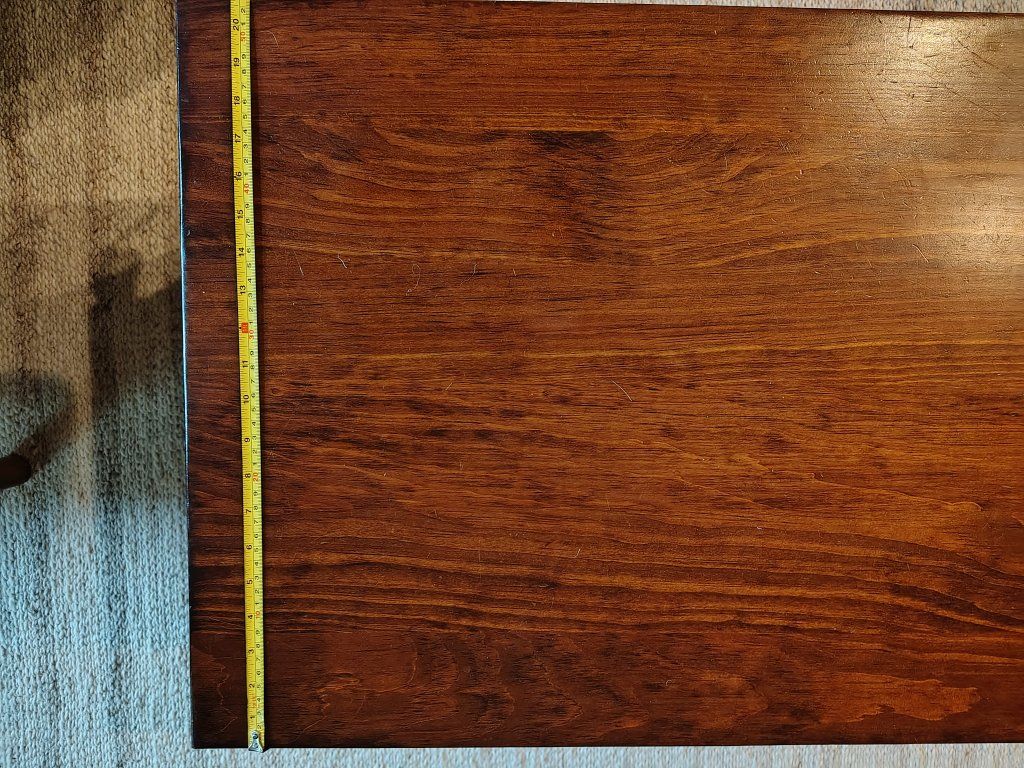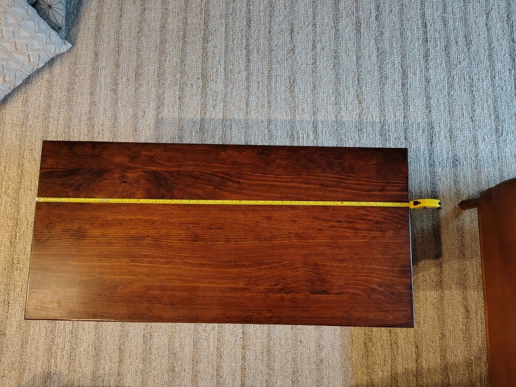 Selling our solid Wood coffee table. It's approximately 44" wide x 20 3/4" deep x 19" tall.