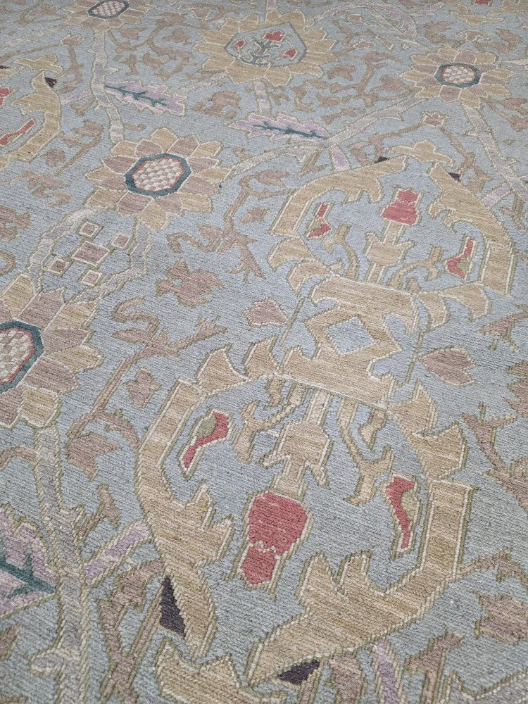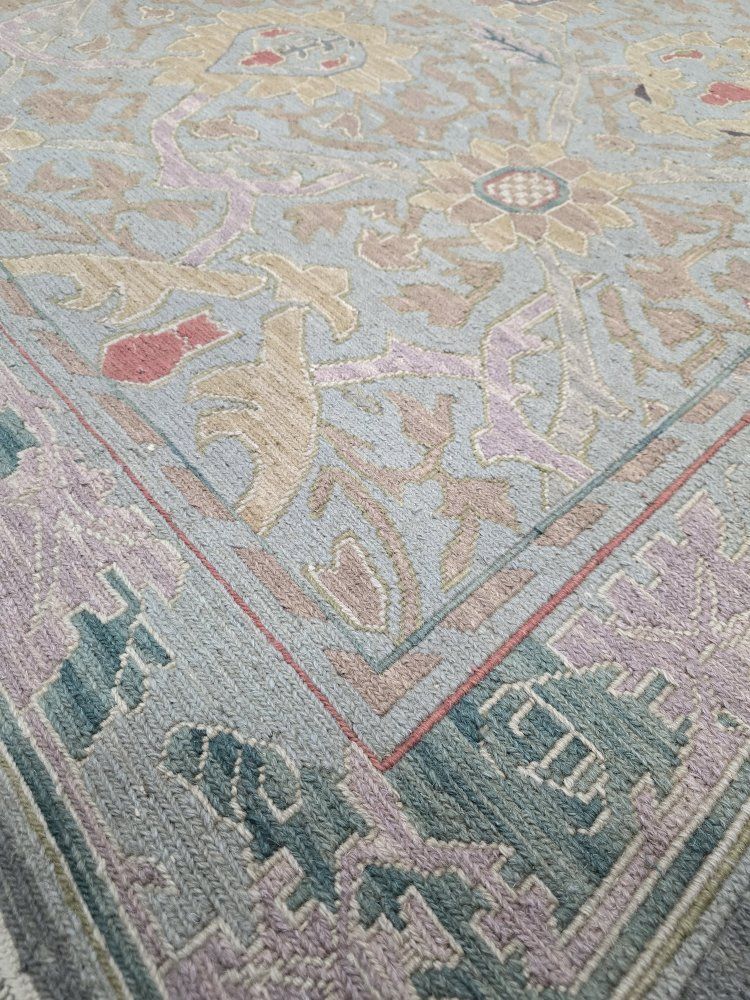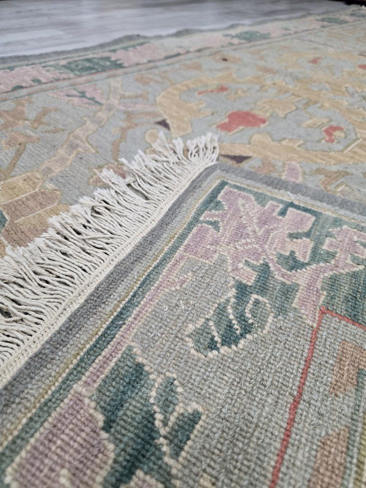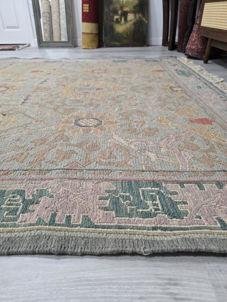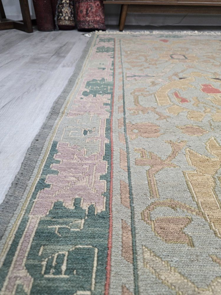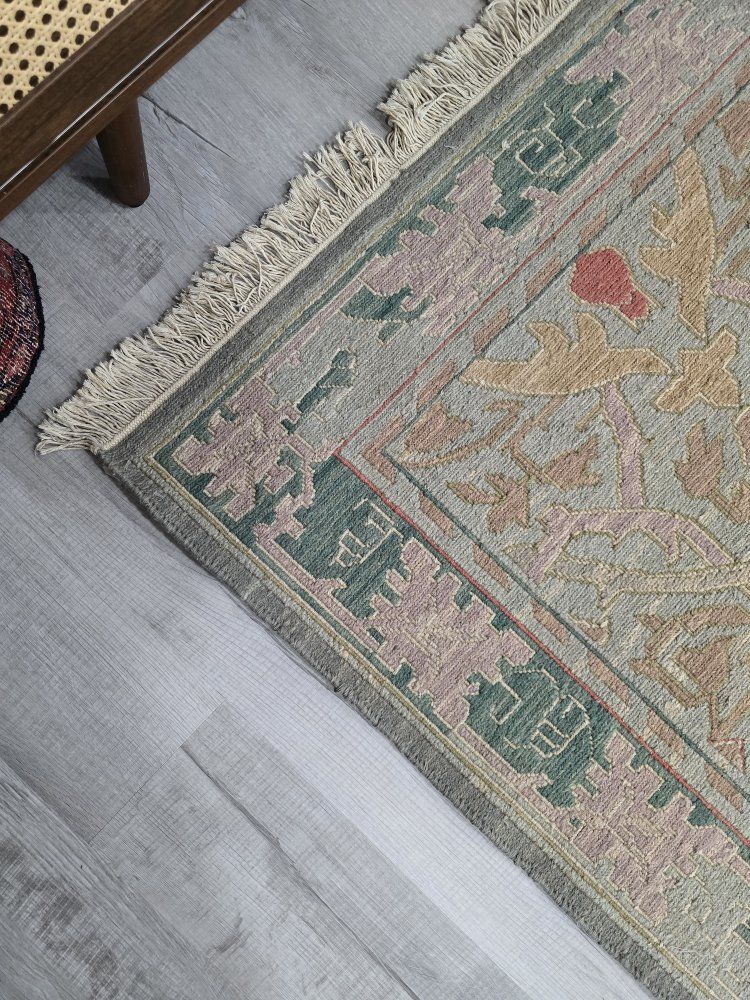 ZelleThis sumak design rug gives you that calm, fresh feeling with its muted palette of sandy beige, gentle sage green, and blush pink. The pinks and greens, especially, add quiet contrast. A rug that will give the space a soft ambiance.