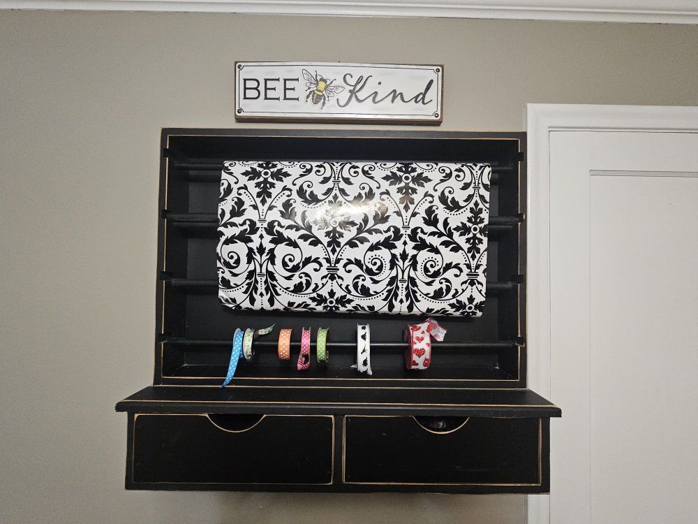VenmoCute black wall holder, could be used to store wrapping paper, ribbon, vinyl, washi tape or regular tape. The options are endless. Has two drawers for great storage and to stay organized