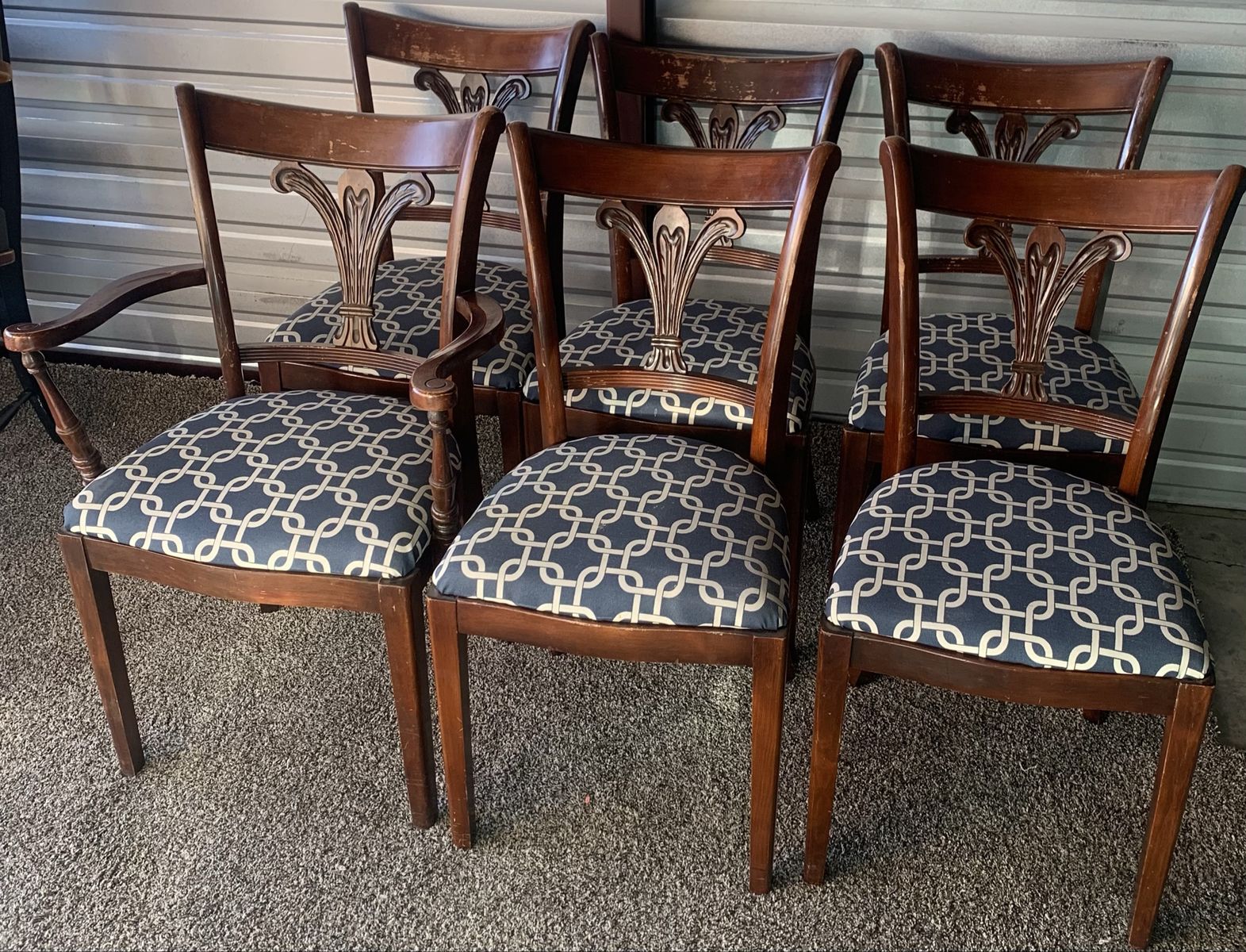 6 Tell City Mahogany Dining Chairs. These are in the very rare FLUER DE LUER BACK Style Chairs. They have the Tell City Label Showing #4620 and Finished in the Mahogany 27. These chairs are in very good condition with normal wear from age and use. Finish still looks great but you will see a blemish here and there. Very minor scratches here or there, all normal for age and use. The seats are all clean and no stains. I have the table that came with the set, if interested let me know. I usually sell separate. Beautiful set, these are the chairs for you.