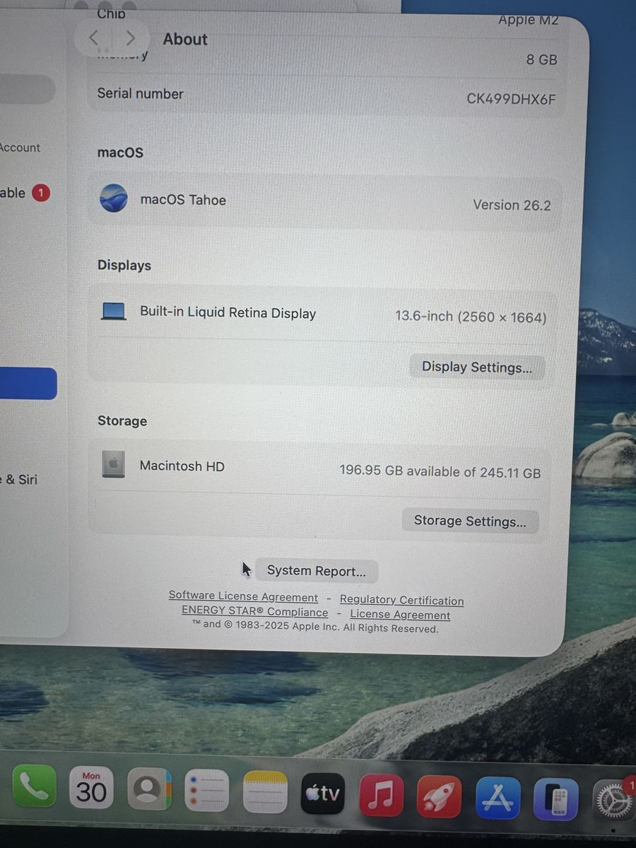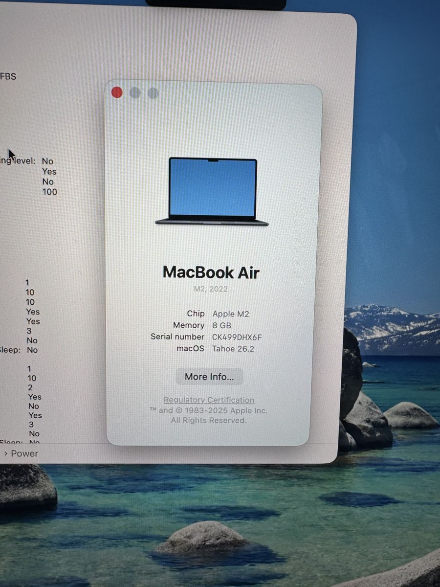 Model: MacBook Air (2022) Chip: Apple M2 RAM: 8GB Storage: 256GB SSD Display: 13.6” Liquid Retina (2560 x 1664)