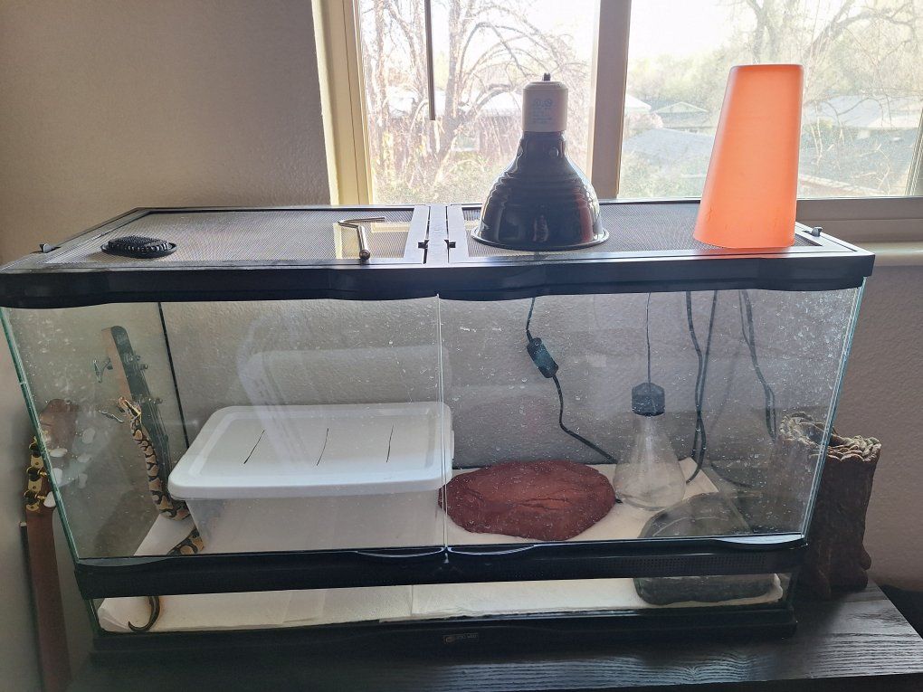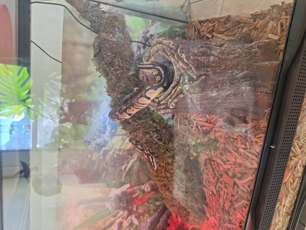 PayPalsuper sweet female fancy ball python 2ish feet, including enclosure, water dish, log humidifier, heat lamp, heat rock, and whatever mice I have left in the freezer when sold. I think she was hatched around November 2025.