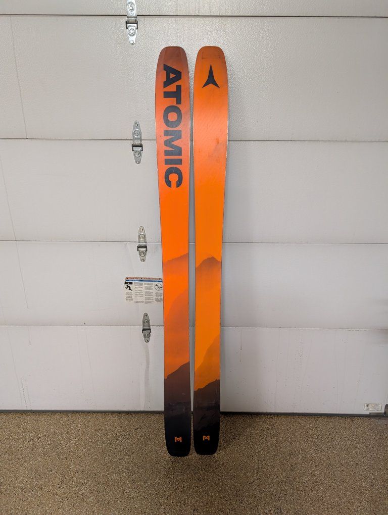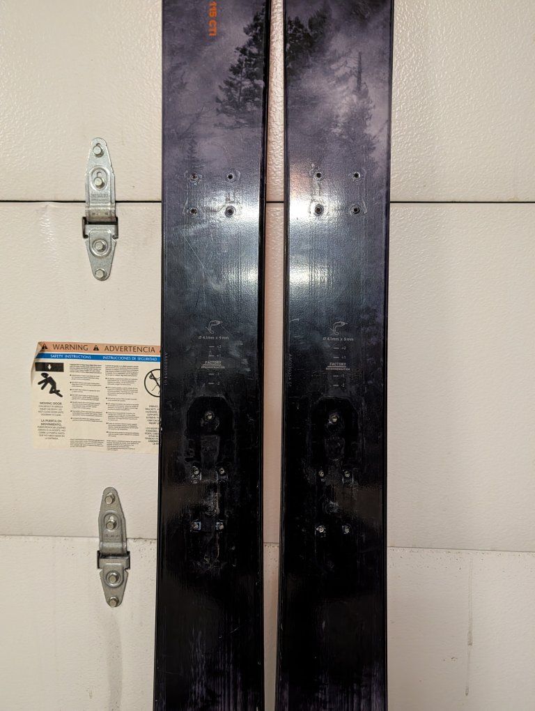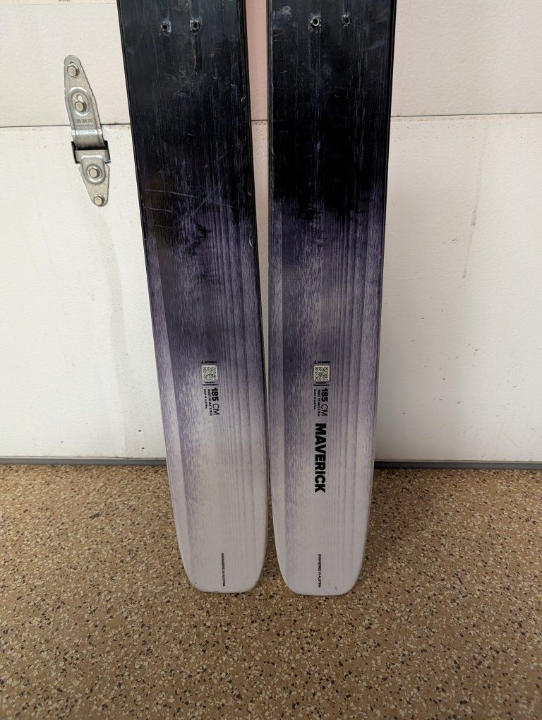 Zelle2024 Atomic Maverick, 115mm underfoot and 185cm tall. Less then 10 days on these skis, I only used them in the backcountry on deep proper days. 1 mount, I had the Atomic Summit 12 (pin) binding mounted on them. Bases are near perfect. Skis only