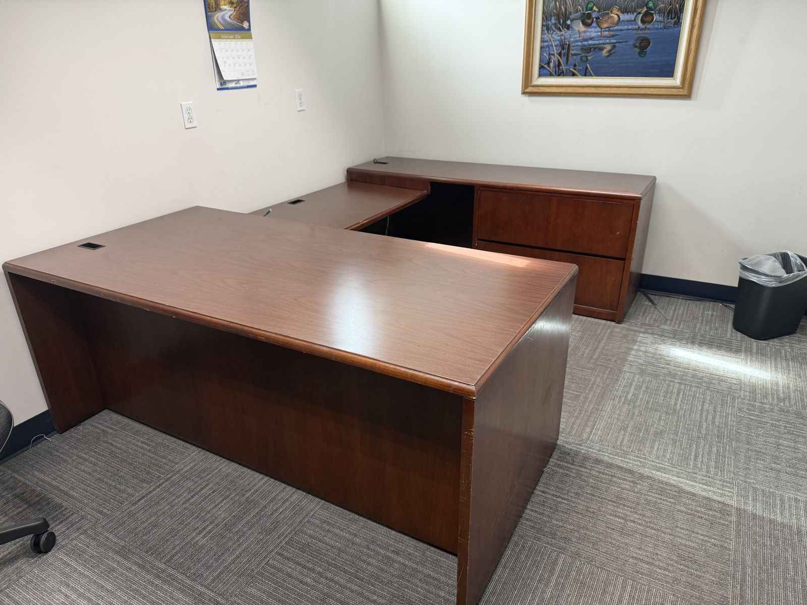 Free desk , front and back pieces are 71 inchs long, side piece is 48 long, 30 inches high. desk depth put together fron to back is 8.66 feet . No holds