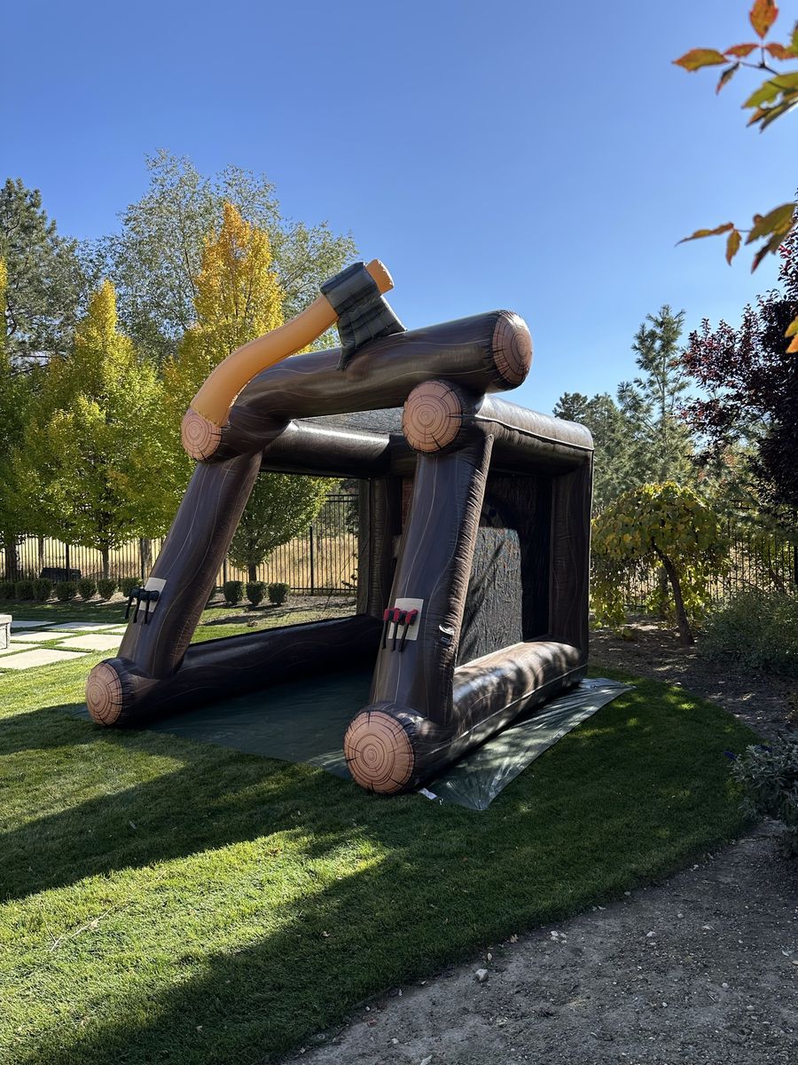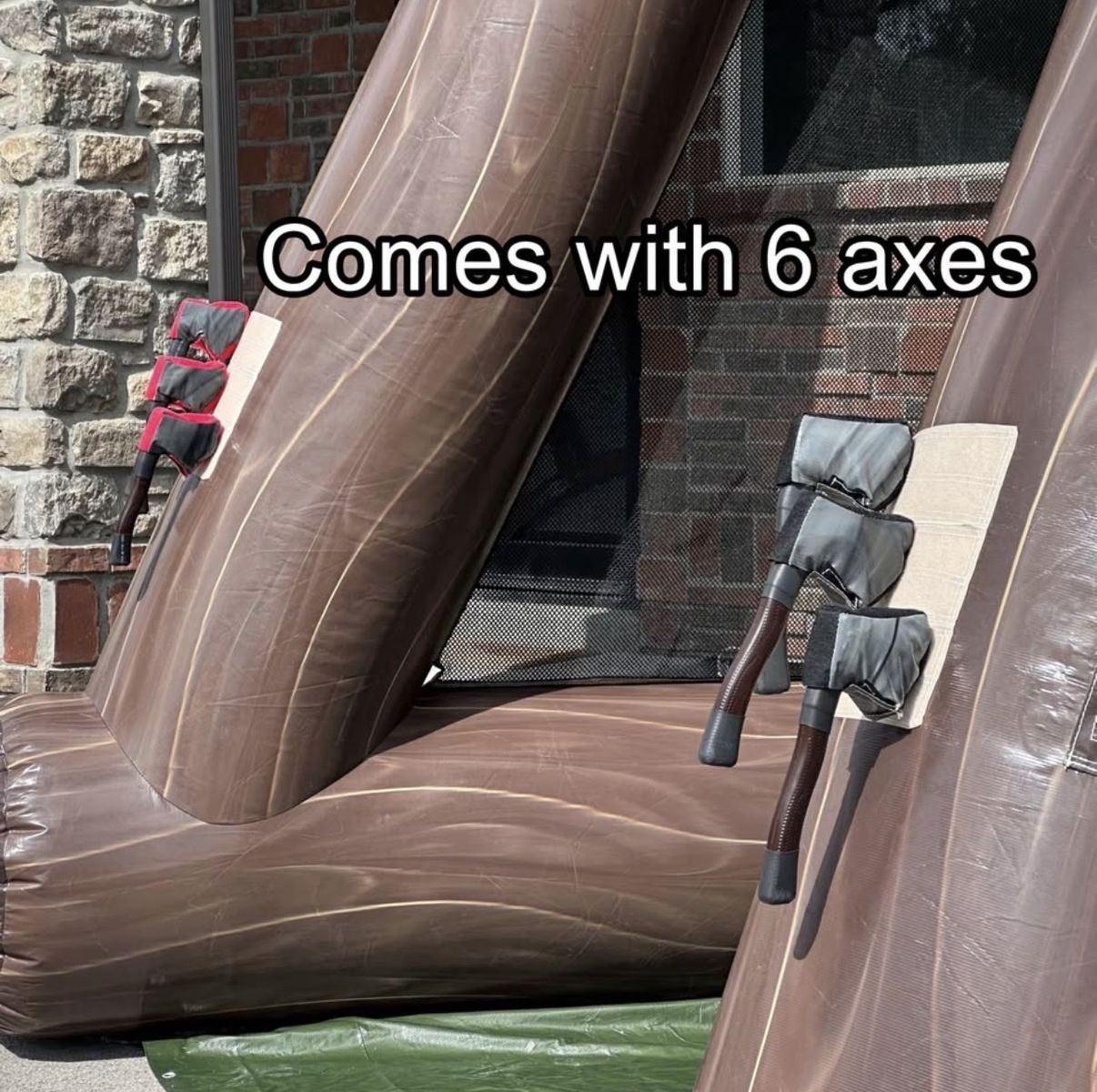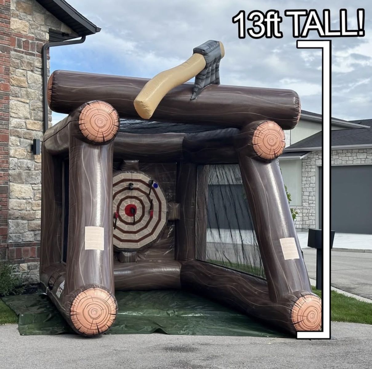 Standing 13ft tall, 11ft wide, and 14ft deep, this HUGE game includes 6 axes, so be sure to only throw them at the target to avoid losing or damaging them. This is the biggest and most flashy way to play this popular game! Although it may resemble a bounce house, do not climb on it for your own safety!
