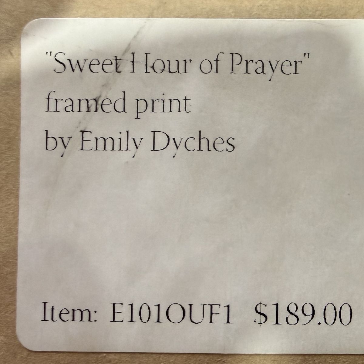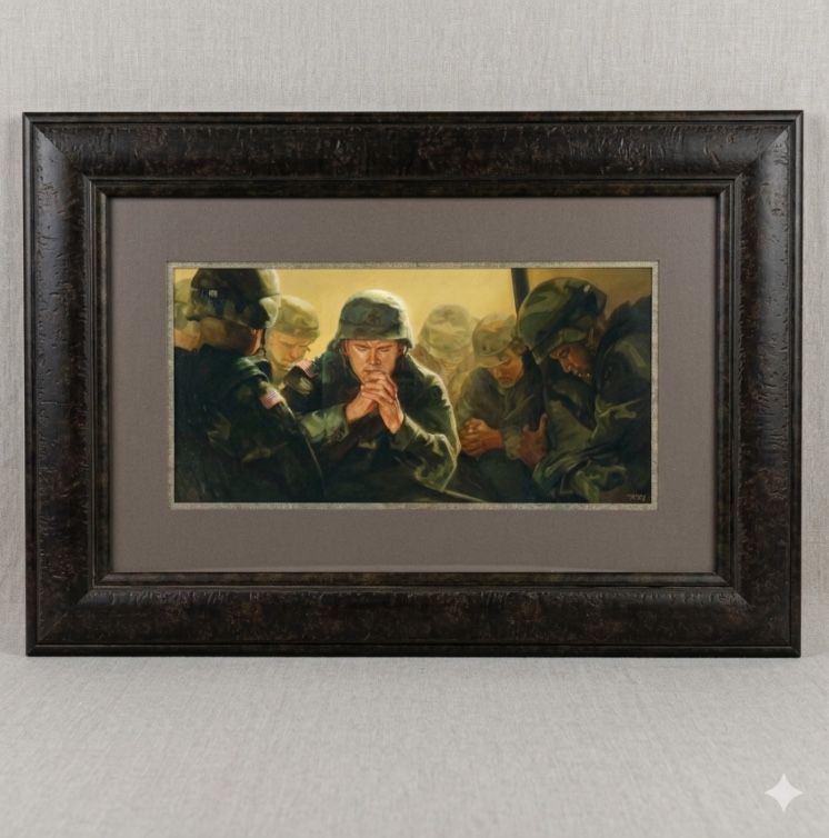 Framed print titled “Sweet Hour of Prayer” by Emily Dyches, published by Altus Fine Art. This piece features a detailed and meaningful military prayer scene, complemented by a high-quality, rustic-style frame that suits a variety of interiors. This is a signed print, making it a more rare and desirable piece for collectors. Only been hung, never stored.
