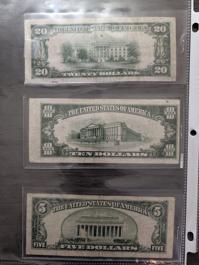 Zelle1934a $20 bill $30 1933a $10 bill(off center on cut) $15 1928c Red seal $5 bill $20