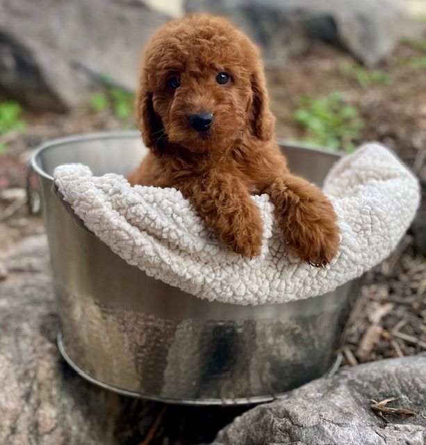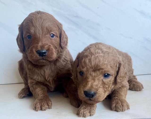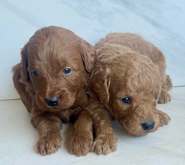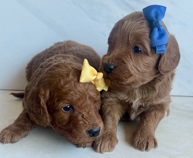 Goldendoodles are a delightful cross between Golden Retrievers and Poodles, combining the best traits of both breeds. They are renowned for their friendly dispositions, intelligence, and low-shedding, hypoallergenic coats. Our deep red Goldendoodles are particularly special, as their rich coat color is both rare and captivating.