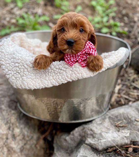 Are you searching for a loyal, friendly, and uniquely marked companion? Look no further! We are delighted to offer a litter of deep red Goldendoodle puppies, each adorned with charming white spots that make them truly stand out. Puppies are 8 weeks old and will be ready to join your family on Friday, 4/11!