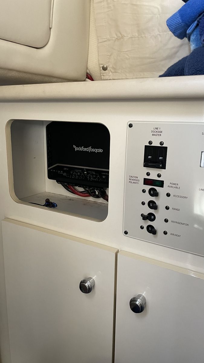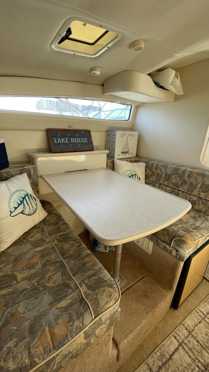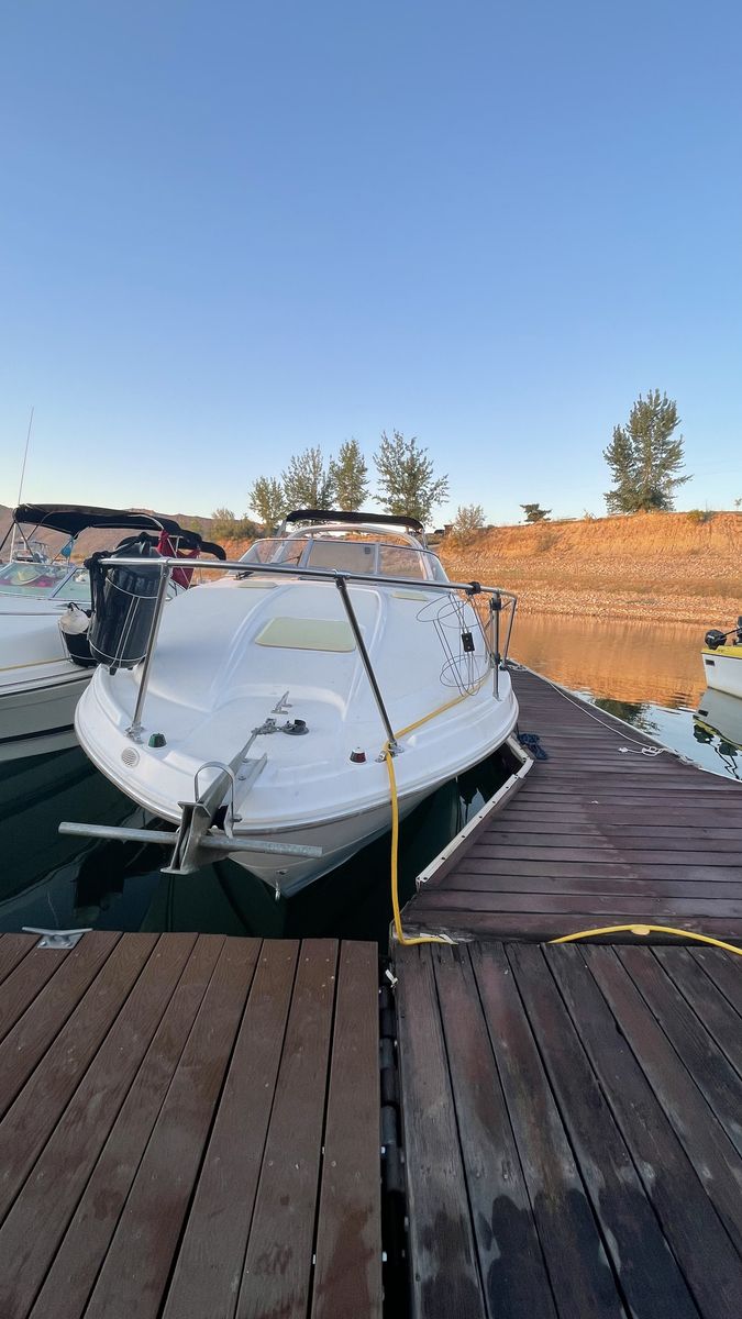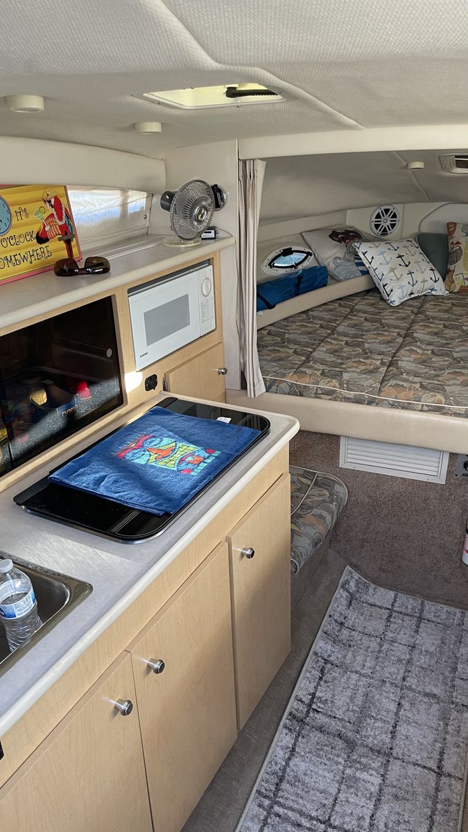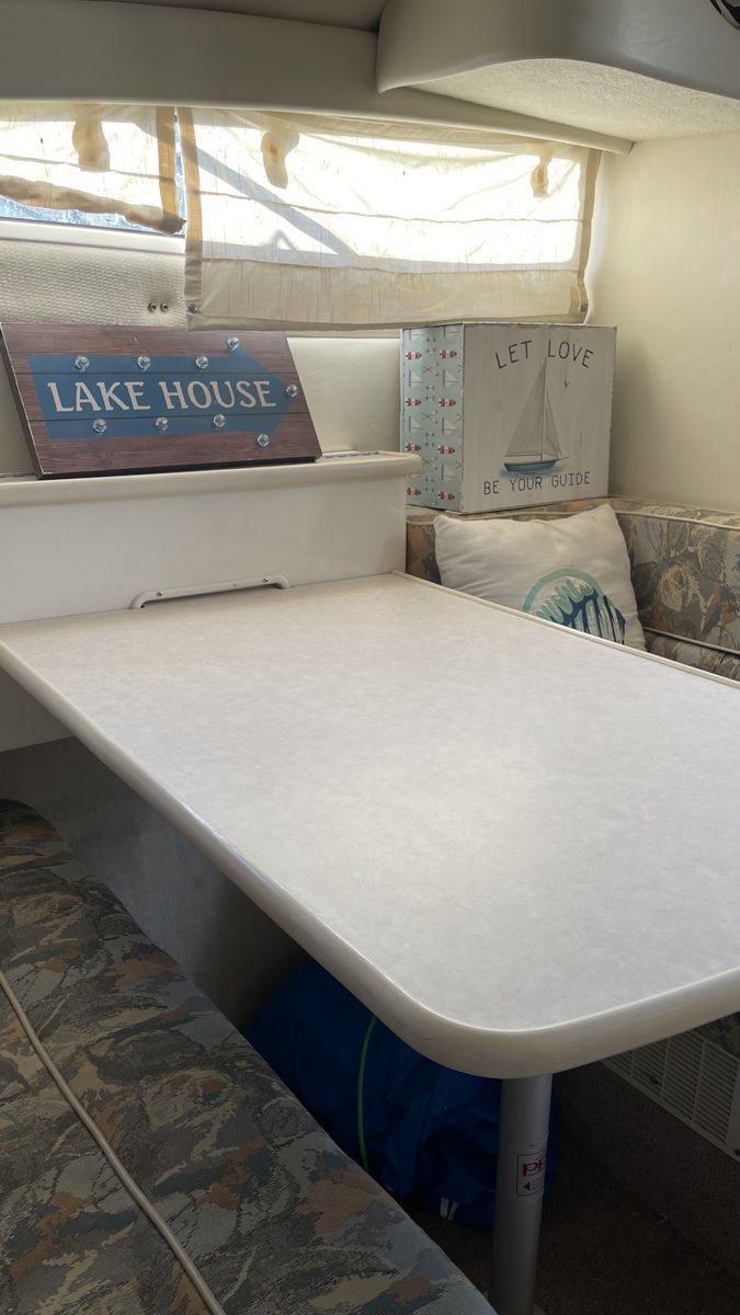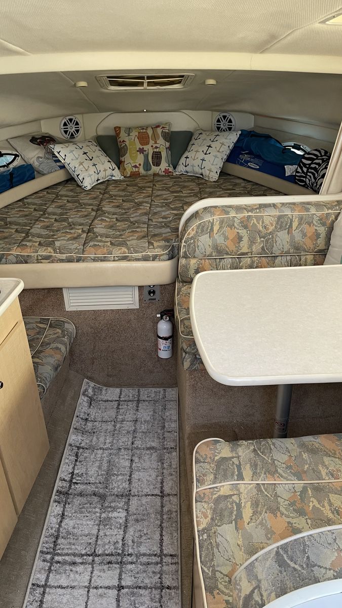 The engine was replaced on our boat right after we got it because it didn't get winterized the year before and it cracked. Since we got this done my ex lost interest in boating so we only took it out about 2 times and it has been sitting in indoor storage at Flaming Gorge for a couple of years. Its a great family boat, that can sleep up to 6 people. There is a bed in the back of the boat as well as the front of the boat and the kitchenette also makes into a bed that could sleep 2 small kids. The engine is a Mercruiser 7.1 liter and has approximately 10 hours on it. There is shorepower that powers the electric stove, AC and Heat, and the fridge which will also run on batteries when not plugged in. There is a bathroom with a hot shower and a toilet inside the cabin as well as a shower on the rear outside of the boat. Full rain enclosure as well as sun shades that were just purchased recently. There is also an extended swim deck which is nice as you can sit lawnchairs out on it and relax. The stereo plays sirius if you get a subscription as well as apple if connected to your iphone and radio when you can get it. There is a microwave as well. If you have any questions please ask. This boat with an older engine would sell for at least the $20000 I am asking and this one has a new engine that cost us $14000 so please don't try to get me to take less as I am already losing a lot of money. You can count on this one lasting you a long time with the new engine.