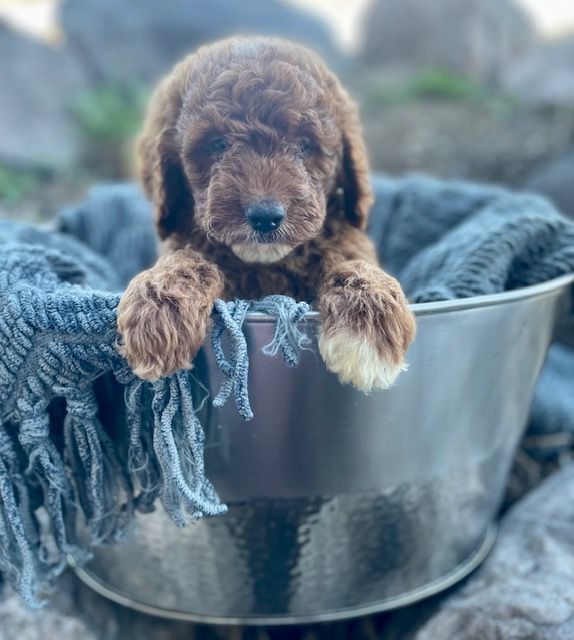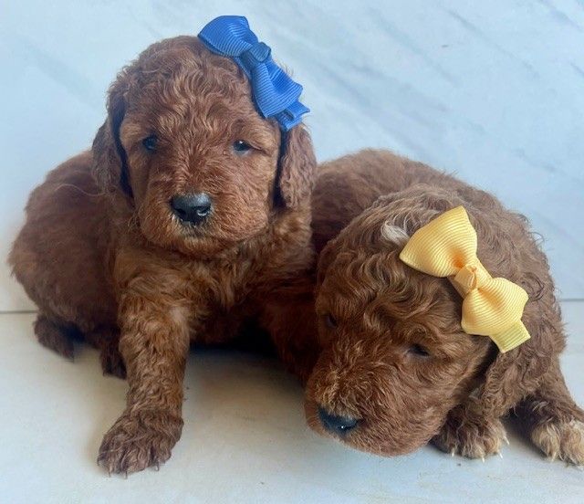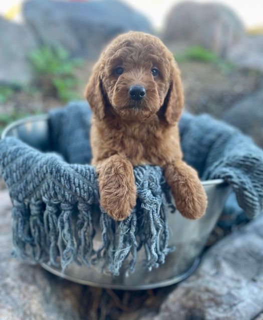 Goldendoodles are a delightful cross between Golden Retrievers and Poodles, combining the best traits of both breeds. They are renowned for their friendly dispositions, intelligence, and low-shedding, hypoallergenic coats. Our deep red Goldendoodles are particularly special, as their rich coat color is both rare and captivating.