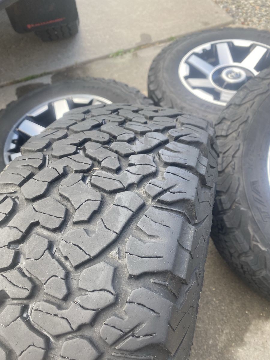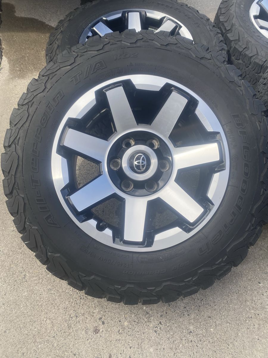 • Tires: BFGoodrich All-Terrain T/A KO2 – 245/70R17 • Mileage: Less than 1,000 miles on the wheels and tires • Condition: Like new, no curb rash or damage • Bolt pattern: Toyota 6x5.5 / 6x139.7