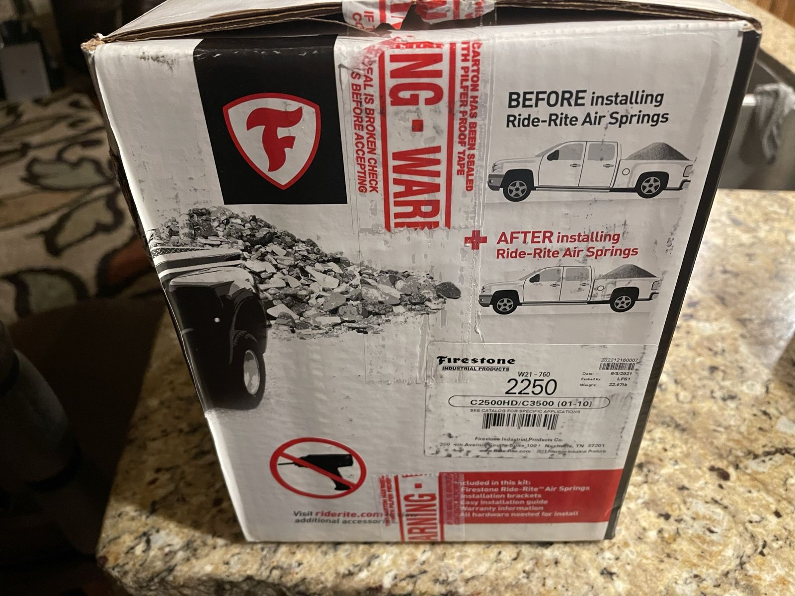 VenmoBrand new Firestone Ride-Rite air spring kit (W21-760-2250), never installed. Designed specifically for: Chevy Silverado 2500HD / 3500 (2001–2010) GMC Sierra 2500HD / 3500 (2001–2010) Fits Duramax trucks. Perfect for towing, hauling, or leveling your truck. Eliminates rear-end sag under heavy loads Improves towing stability and ride quality Adjustable air pressure for comfort or heavy-duty use Heavy-duty Firestone quality Complete kit – all brackets and hardware included Condition: Brand new, never used Price: $325 OBO Save money vs buying new from a store. Ready to install. Message me if interested!