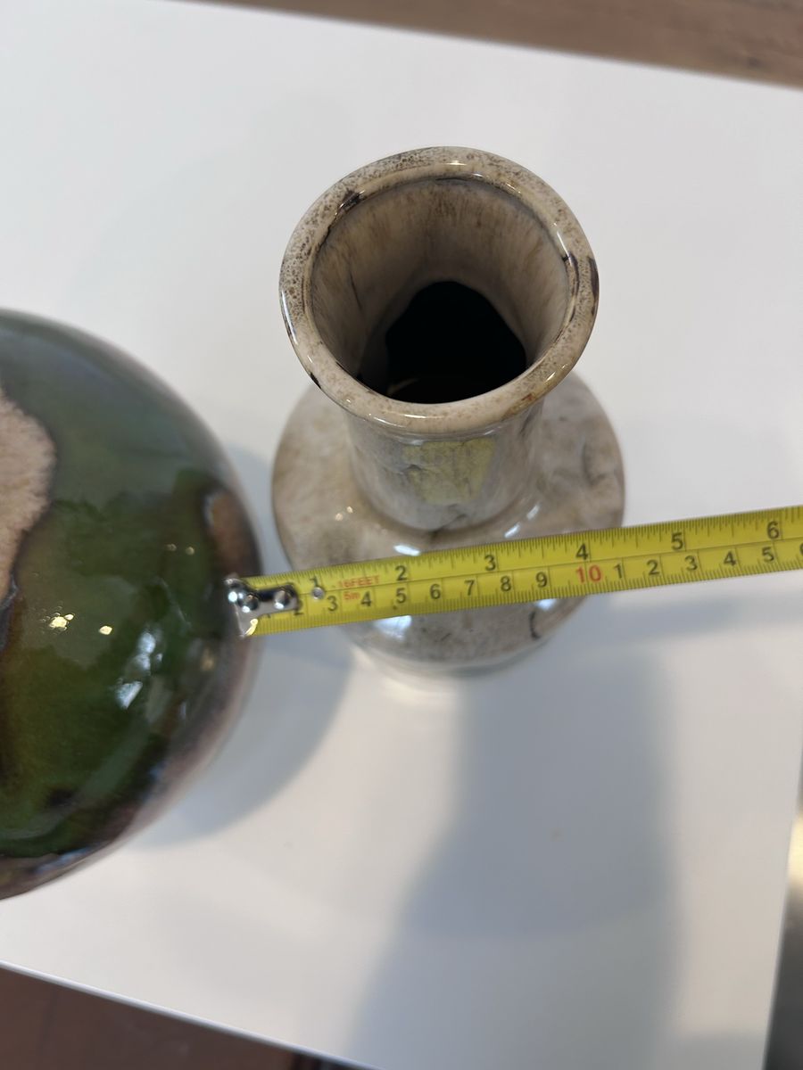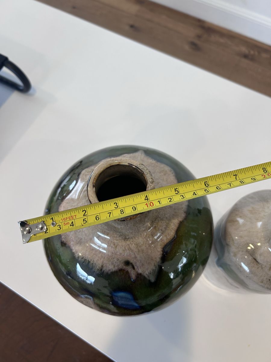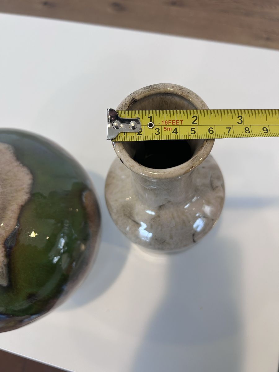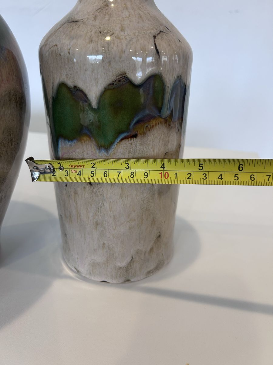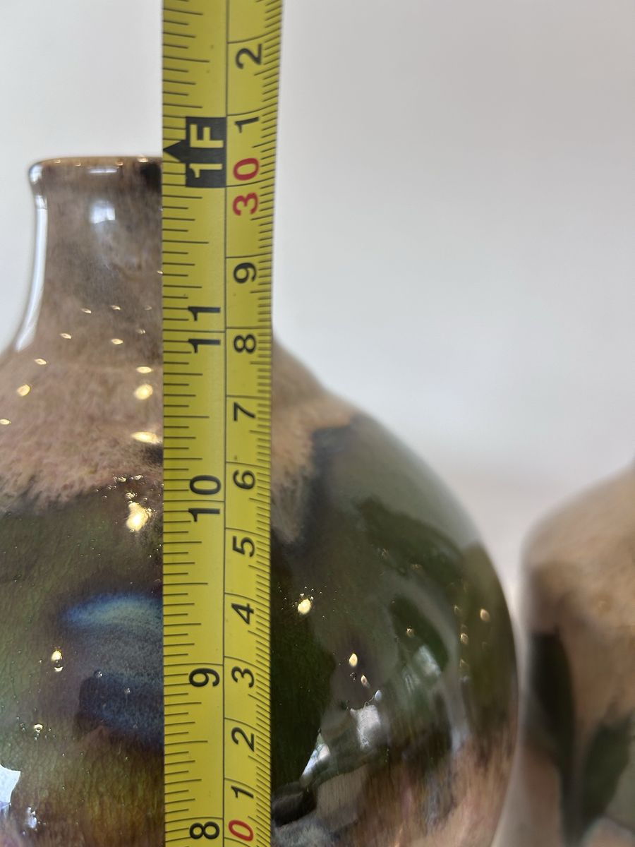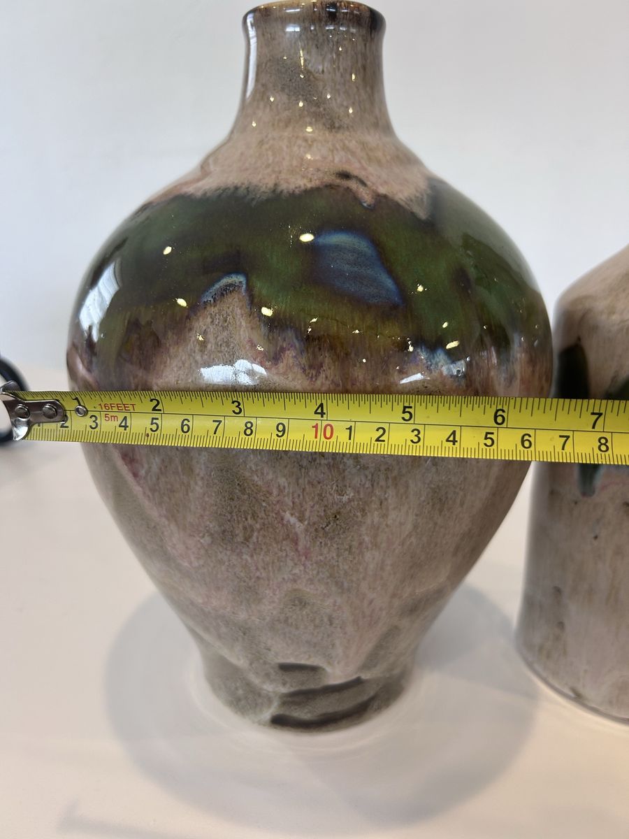 ZelleThis decorative pottery set, handmade in North America in the late 20th century, features an abstract pattern in multicolor. Made from clay and ceramic, this original art pottery set includes two vases with a glossy finish. The hand-painted, color-changing design adds a unique touch to any space, making it a perfect decorative accent for any home. Ideal for collectors or those looking to add a one-of-a-kind piece to their decor, this set showcases the craftsmanship and style of the era.