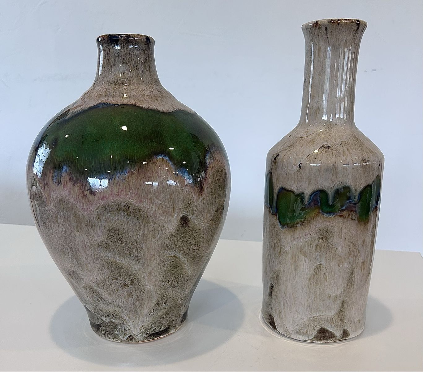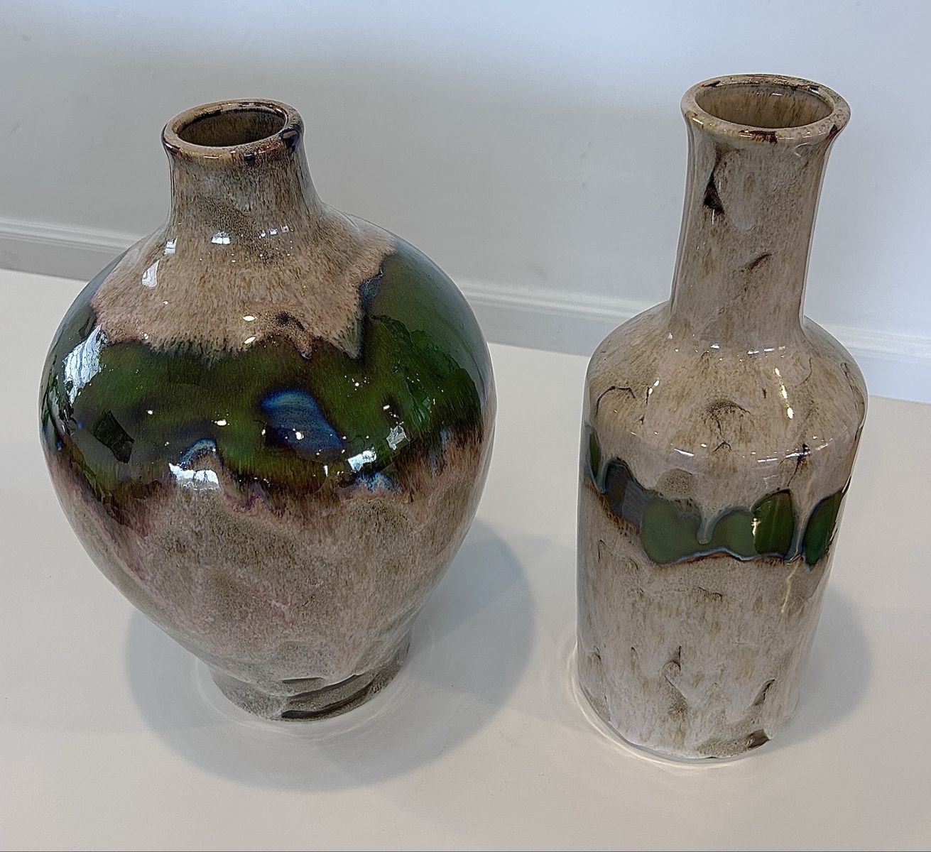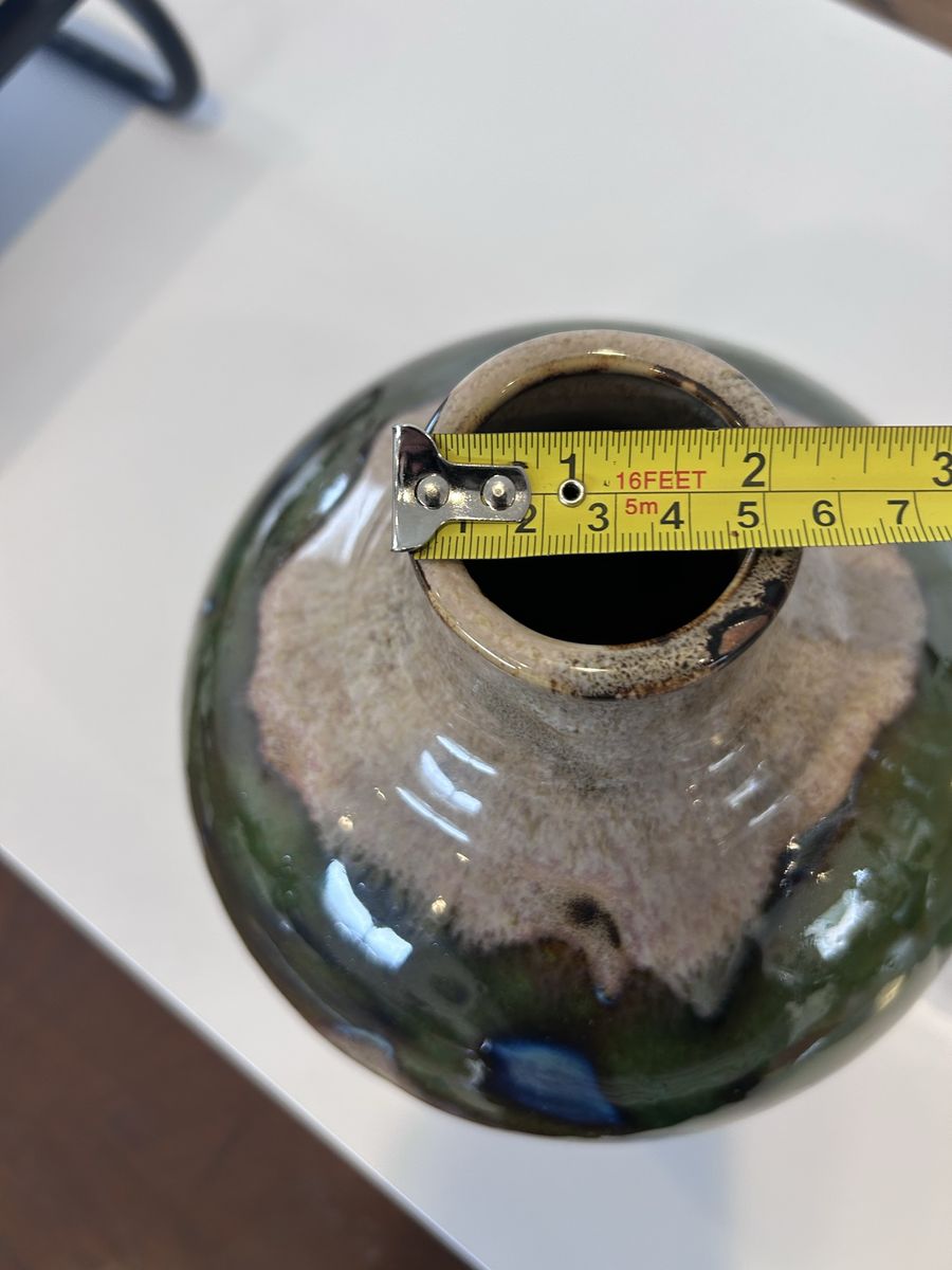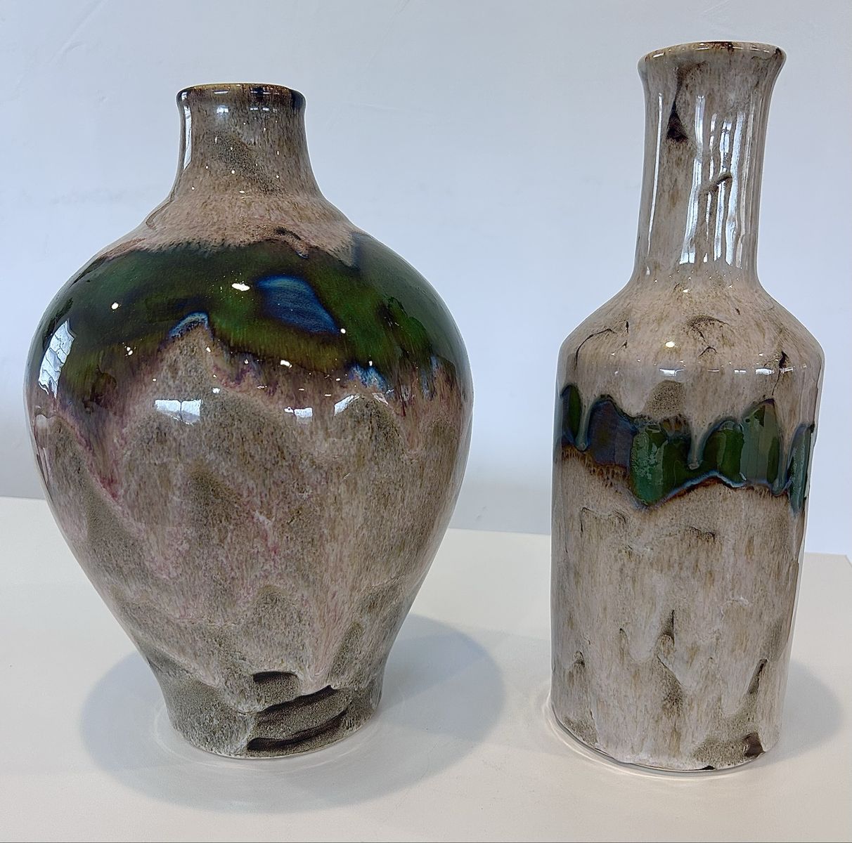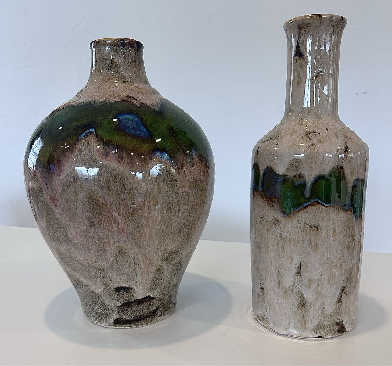 ZelleThis decorative pottery set, handmade in North America in the late 20th century, features an abstract pattern in multicolor. Made from clay and ceramic, this original art pottery set includes two vases with a glossy finish. The hand-painted, color-changing design adds a unique touch to any space, making it a perfect decorative accent for any home. Ideal for collectors or those looking to add a one-of-a-kind piece to their decor, this set showcases the craftsmanship and style of the era.