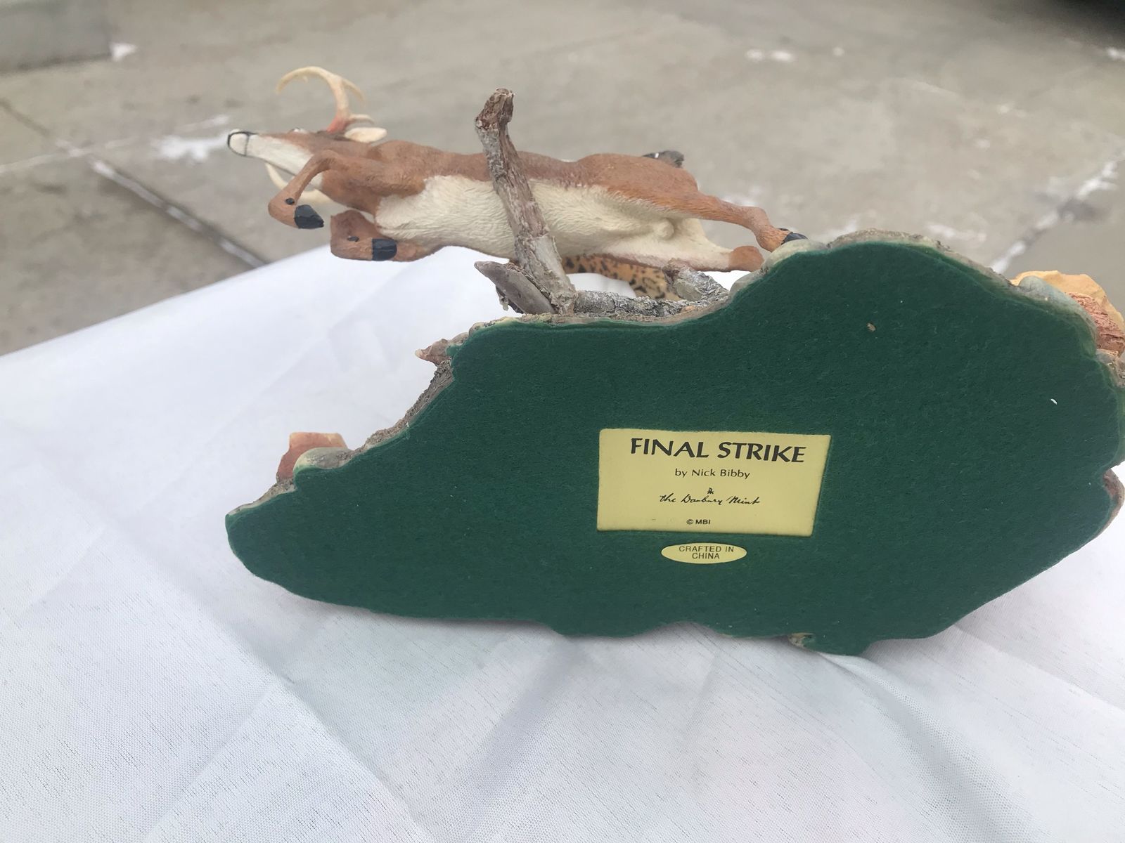 Danbury Mint "Final Strike" by Nick Bibby An incredibly detailed sculpture capturing the drama of a jaguar in pursuit of a whitetail deer through the Mexican desert. This cold-cast porcelain sculpture is in its original styrofoam and shipping box. Mint condition - no chips or scratches. Also includes Certificate of Authenticity. Would make an excellent addition to anyone’s collection! It comes with a Certificate of Ownership and Authenticity bearing my name as the original owner.