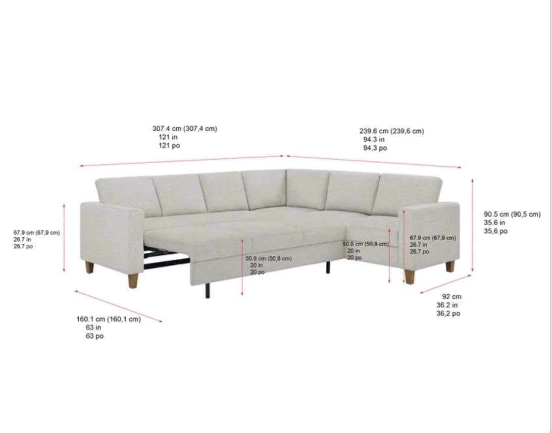 LAF Sleeper Sofa: 85.8" L x 36.2" W x 35.6" H; Weight: 188.48Ibs. RAF 1-arm loveseat: 59.1" L x 36.2" W x 35.6" H; Weight: 85.98Ibs. Corner Chair: 35.8" L x 35.8" W x 35.6" H; Weight: 59.96Ibs. Additional Dimensions: