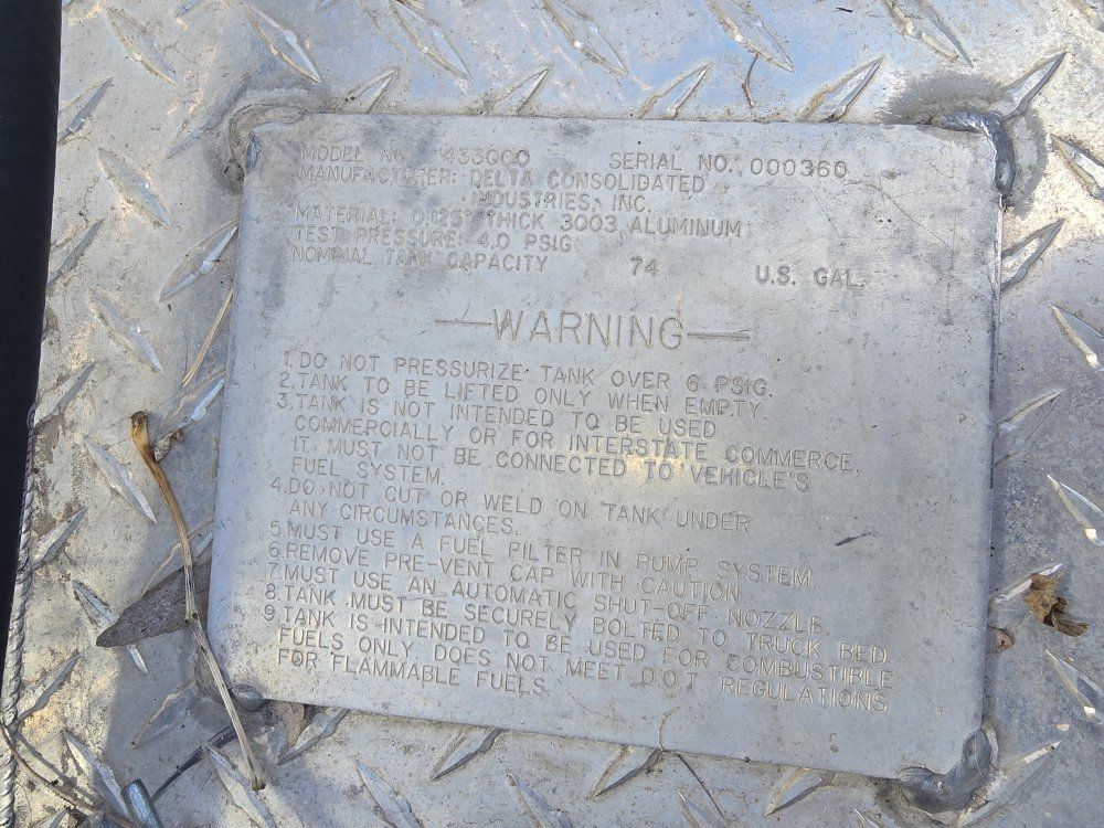 Aluminum 74 gallon tank. pretty small. very fine hairline crack on the bottom left. can't even see it. should be an easy fix. very small leak more of a light saturation. Was in the bed of my 99 F350 just don't need it anymore. New pump and new filter as well as delivery hose and handle.