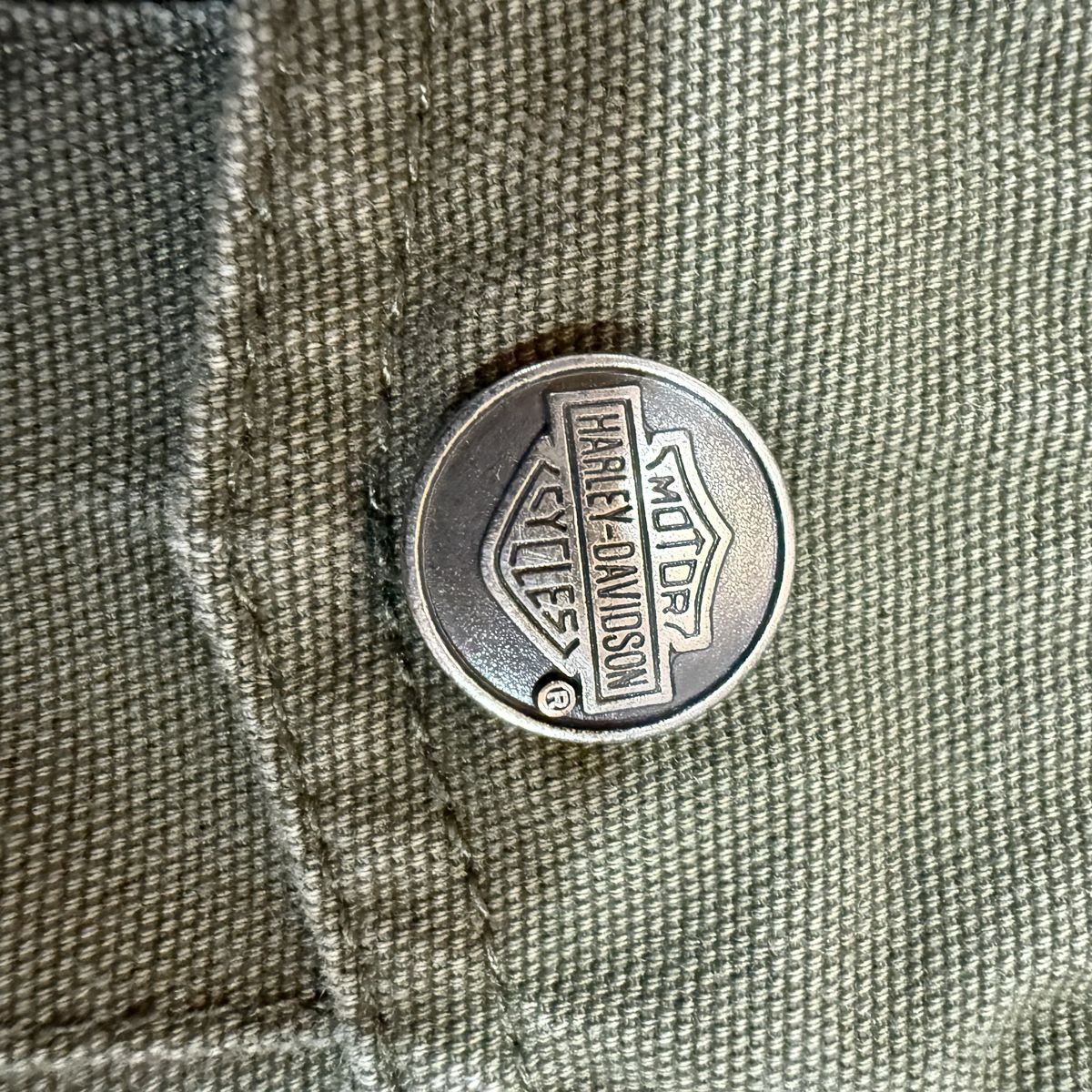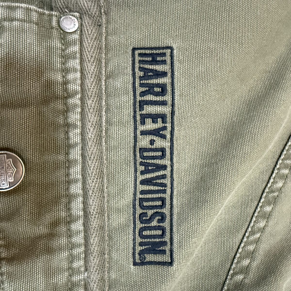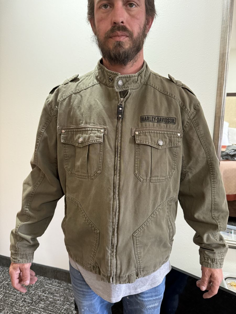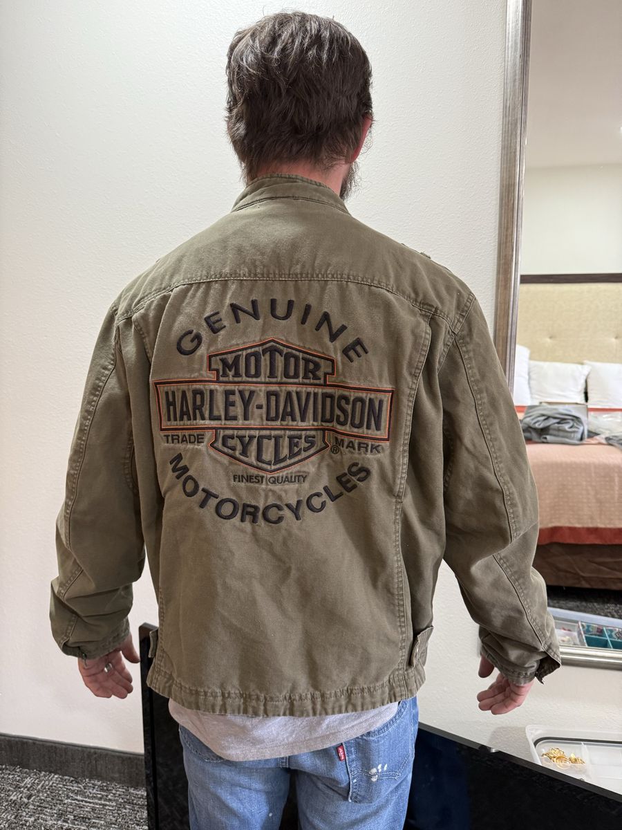 ApplePayGear up with this authentic Harley-Davidson military-inspired field jacket. Built from heavy-duty 100% cotton canvas, this jacket features a rugged, lived-in olive drab color and premium embroidery. Key Features: • Back Detail: Massive, high-density "Genuine Harley-Davidson Motor Cycles" embroidered logo. • Front Detail: Embroidered H-D patch on the left chest and branded hardware. • Tactical Style: Snap-button shoulder epaulets and dual chest cargo pockets. • Build: Full-zip front with a mock neck collar for wind protection. • Authenticity: Official "An American Legend" labeling (RN 103819 / CA 03402). Condition: Excellent pre-owned condition. The canvas has a great natural patina with no rips, holes, or stains. Zippers and snaps all work perfectly. From a smoke-free home.