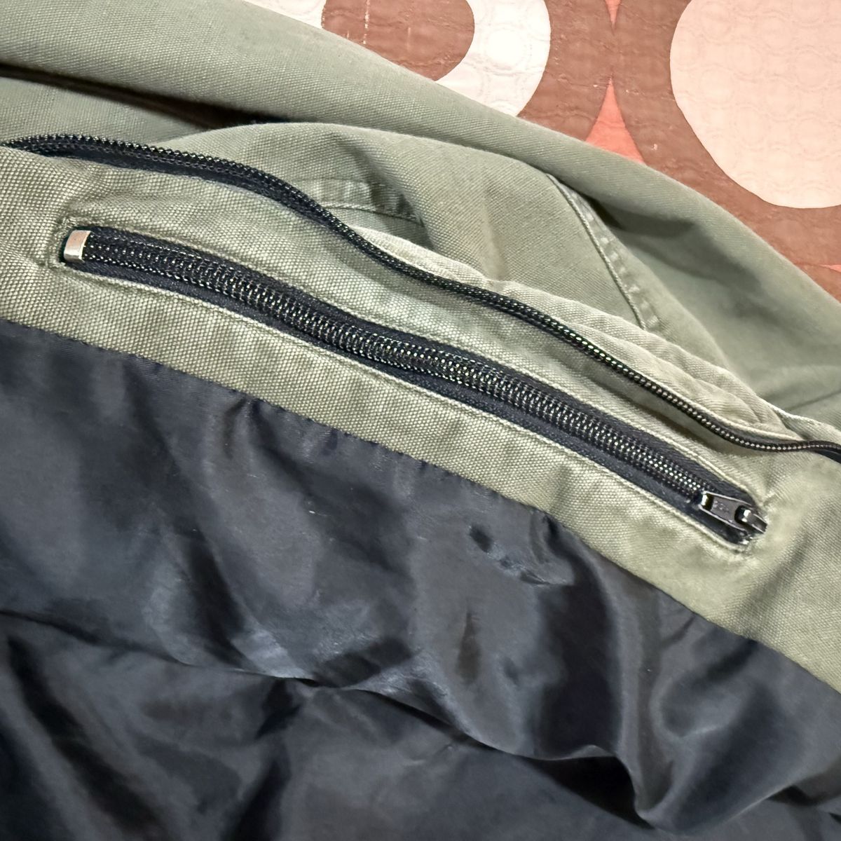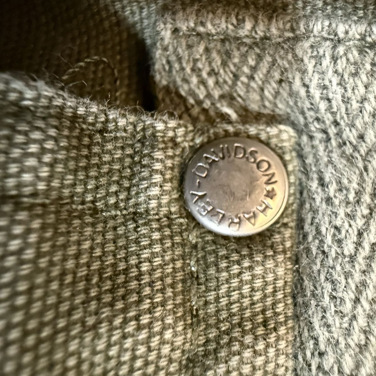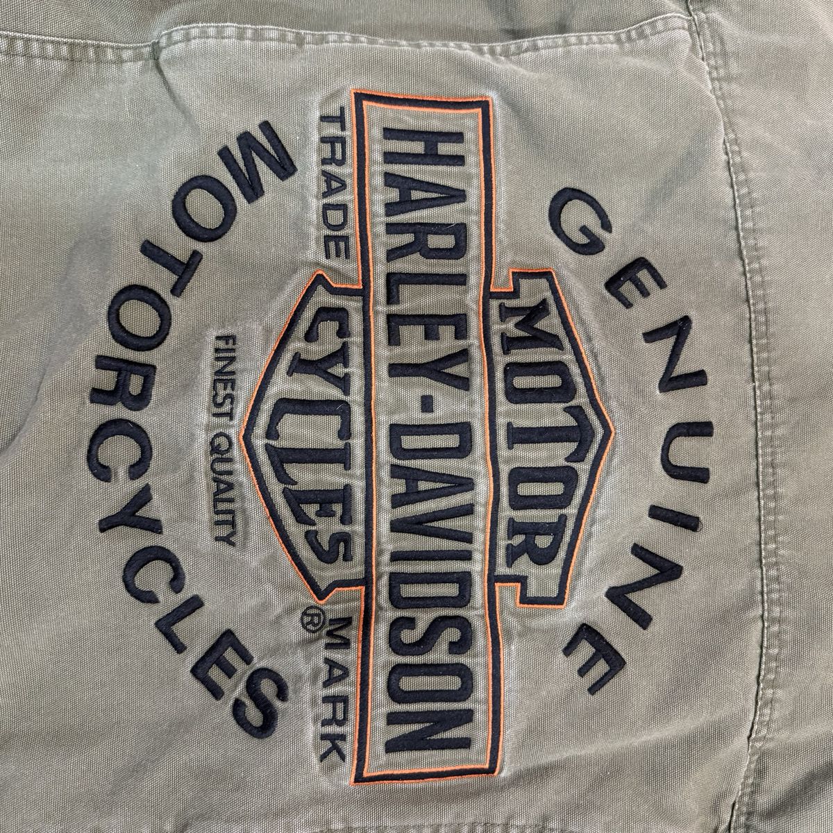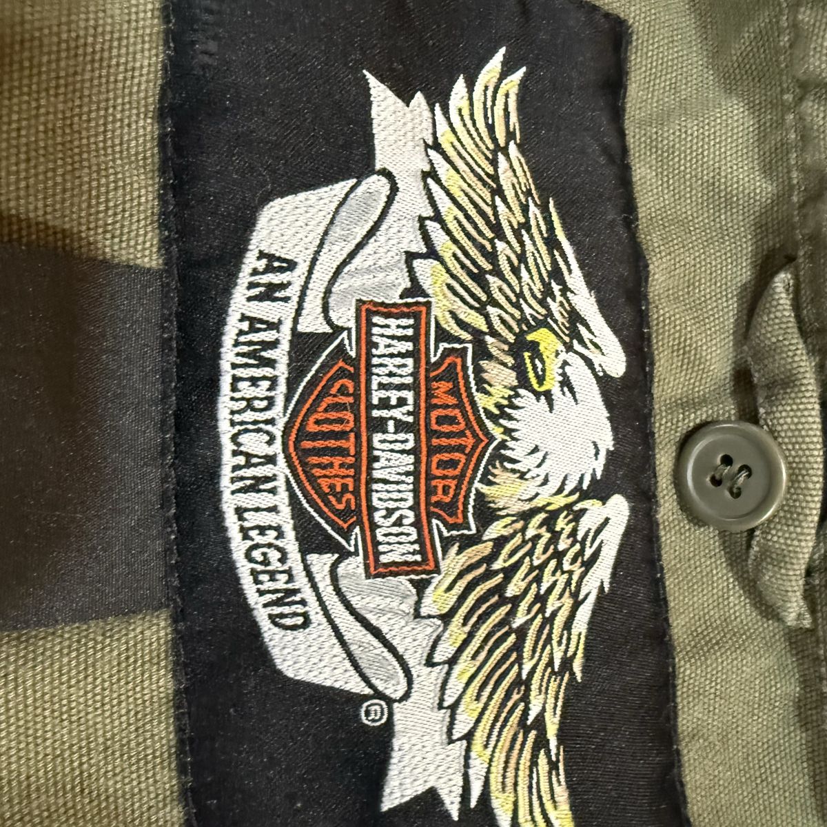 ApplePayGear up with this authentic Harley-Davidson military-inspired field jacket. Built from heavy-duty 100% cotton canvas, this jacket features a rugged, lived-in olive drab color and premium embroidery. Key Features: • Back Detail: Massive, high-density "Genuine Harley-Davidson Motor Cycles" embroidered logo. • Front Detail: Embroidered H-D patch on the left chest and branded hardware. • Tactical Style: Snap-button shoulder epaulets and dual chest cargo pockets. • Build: Full-zip front with a mock neck collar for wind protection. • Authenticity: Official "An American Legend" labeling (RN 103819 / CA 03402). Condition: Excellent pre-owned condition. The canvas has a great natural patina with no rips, holes, or stains. Zippers and snaps all work perfectly. From a smoke-free home.
