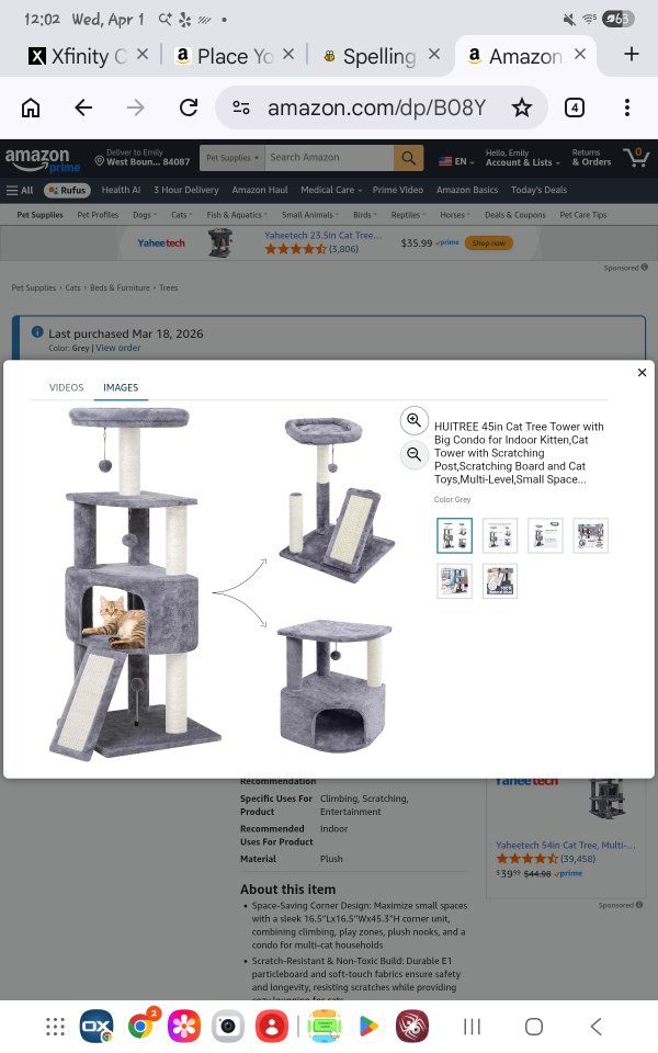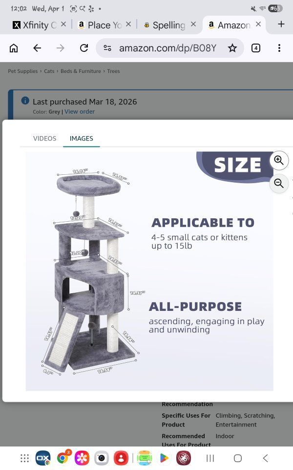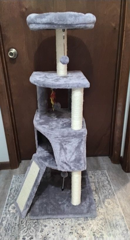 ZelleMedium size cat tower. New. Fully assembled. Used for 4 days. Paid $40. Selling for $20