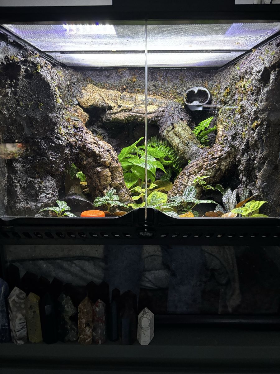 18 inch cube 25 gallons has tons of plants 3 shoe horn shells for hiding and live moss all around with tons of wood included!