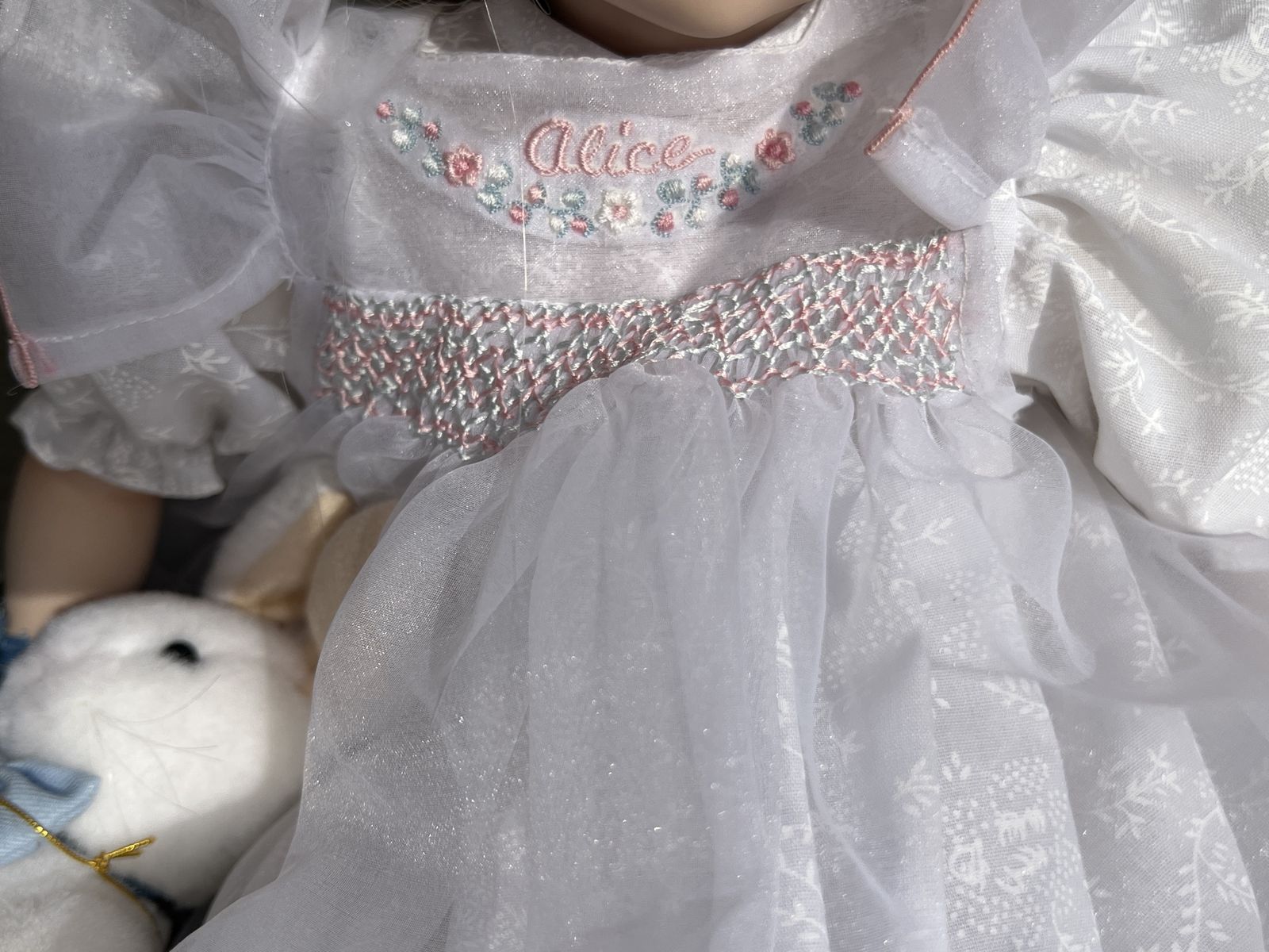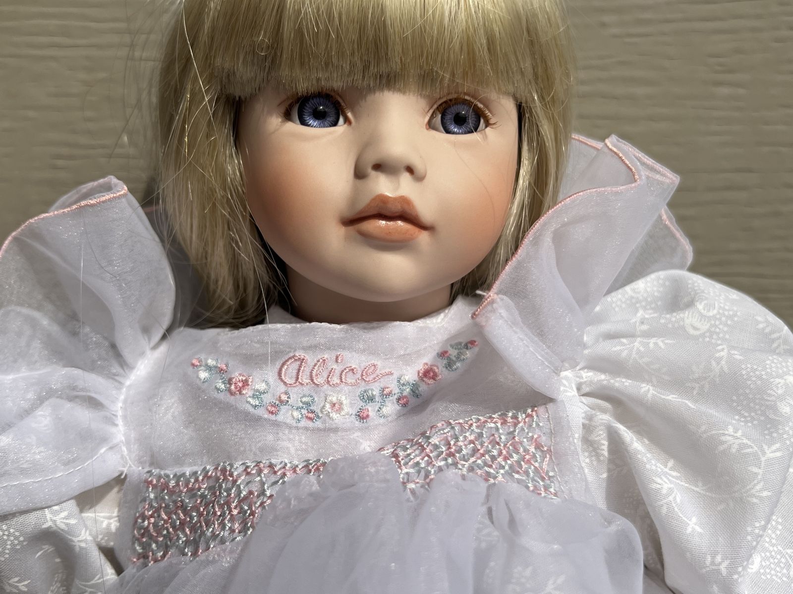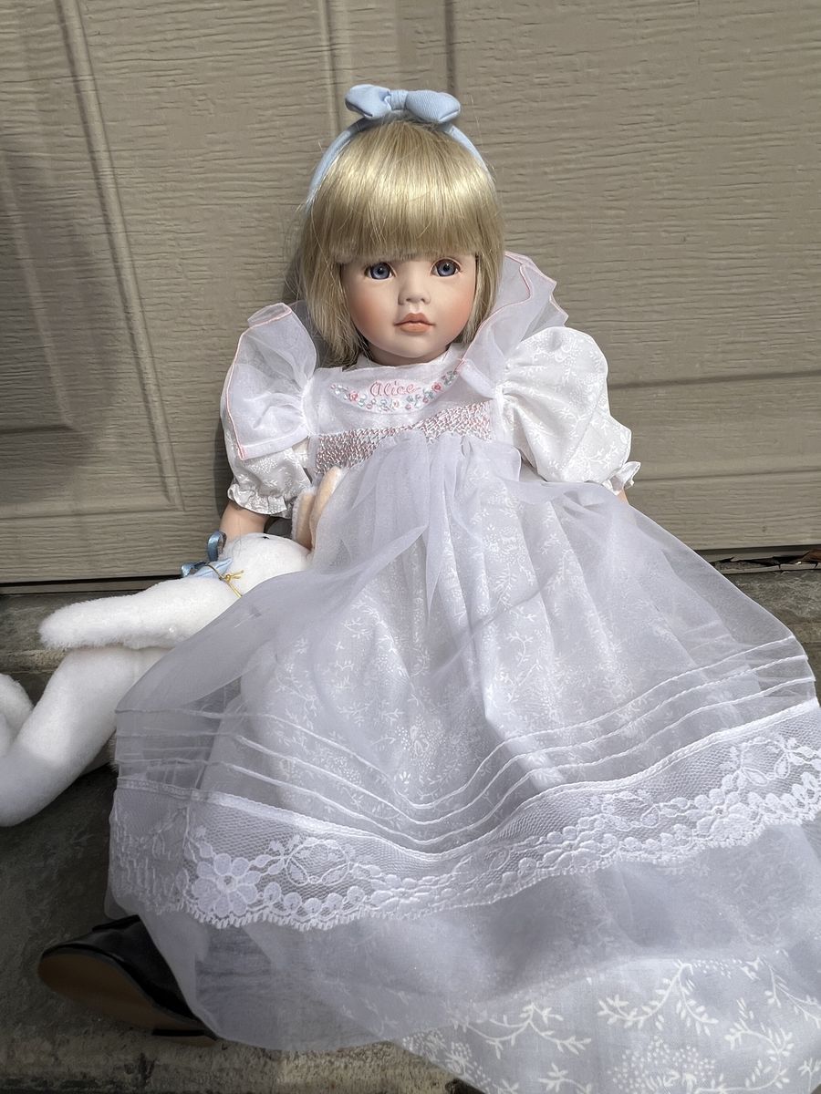 VenmoPerfect for Easter! This vintage 1990s porcelain doll is Alice. She is dressed in a beautiful smocked and embroidered white multi-layer dress, black leather shoes, and a blue headband. A stuffed bunny rabbit is her companion. Her hair is long and tangle free. Signed and numbered 585/1500, she comes with original paperwork, box, and the $198 price tag. A beautiful doll in perfect condition. Pick up in Draper from pet and smoke free home. Cash or Venmo. $120.