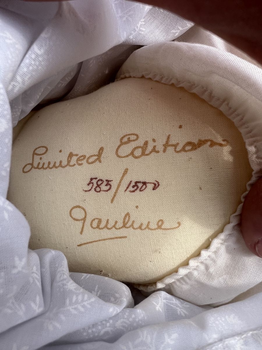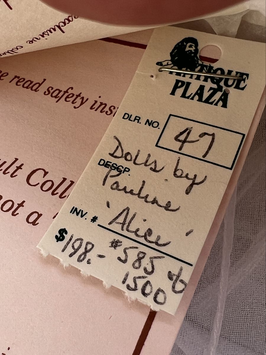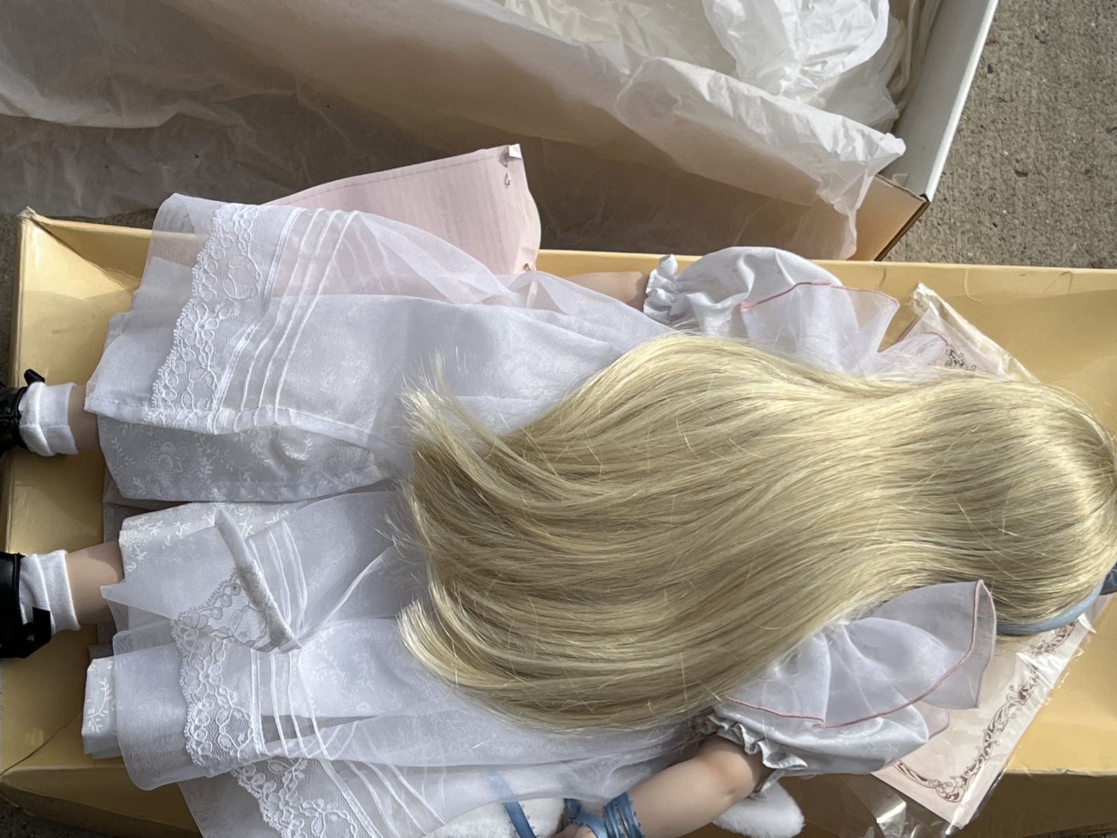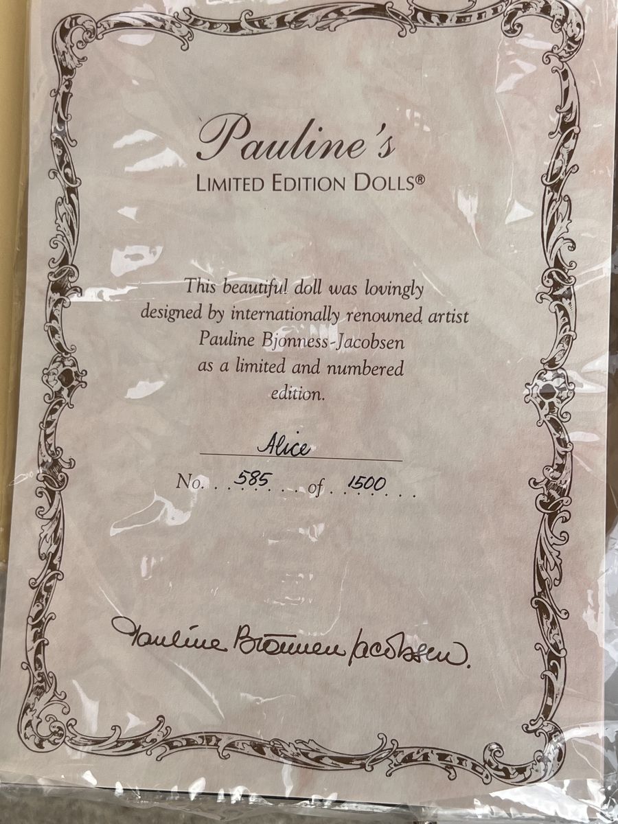 VenmoPerfect for Easter! This vintage 1990s porcelain doll is Alice. She is dressed in a beautiful smocked and embroidered white multi-layer dress, black leather shoes, and a blue headband. A stuffed bunny rabbit is her companion. Her hair is long and tangle free. Signed and numbered 585/1500, she comes with original paperwork, box, and the $198 price tag. A beautiful doll in perfect condition. Pick up in Draper from pet and smoke free home. Cash or Venmo. $120.