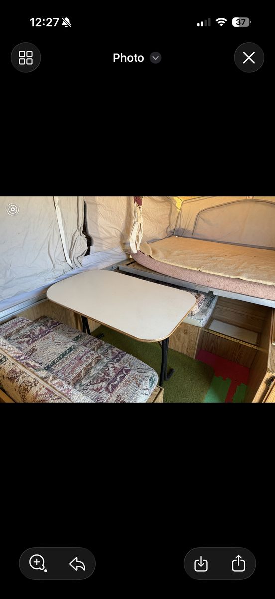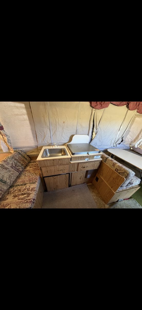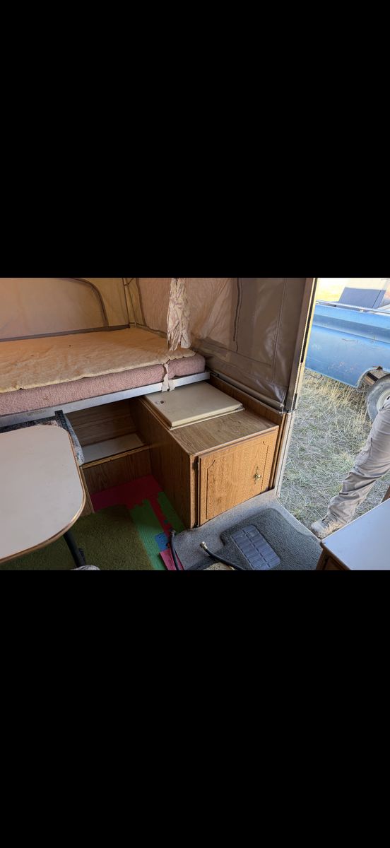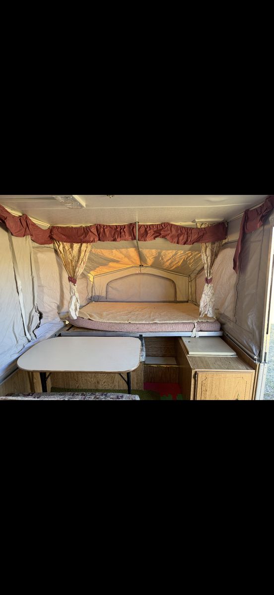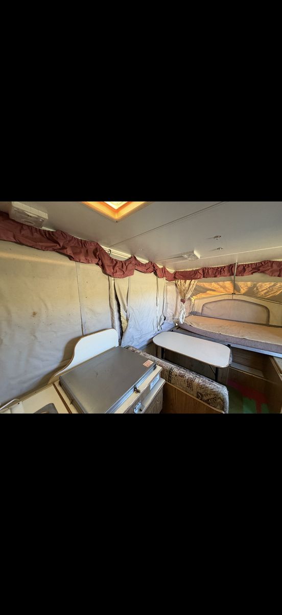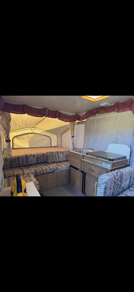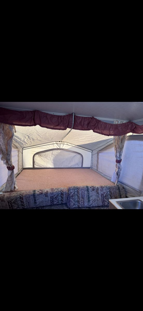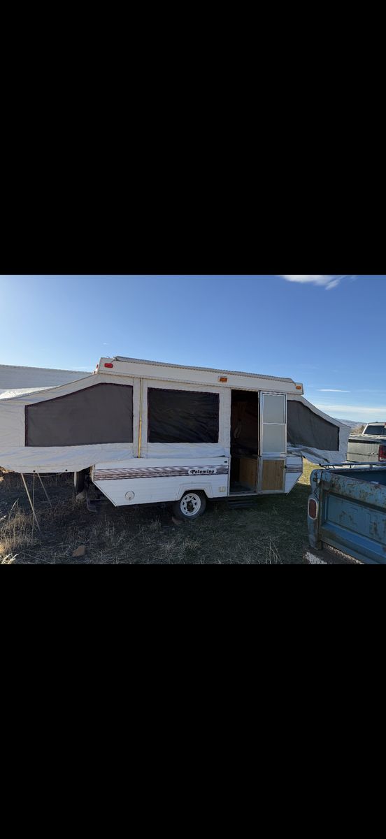Palomino Filly pop up tent trailer 1994. This is the perfect affordable pop up tent trailer in good condition. Two queen bed pop outs and the table folds out into a bed. Includes a sink and stove. Floor is covered by mats but otherwise in good condition. Awning folds out. Ready to go for Easter weekend! Call or text to come take a look!