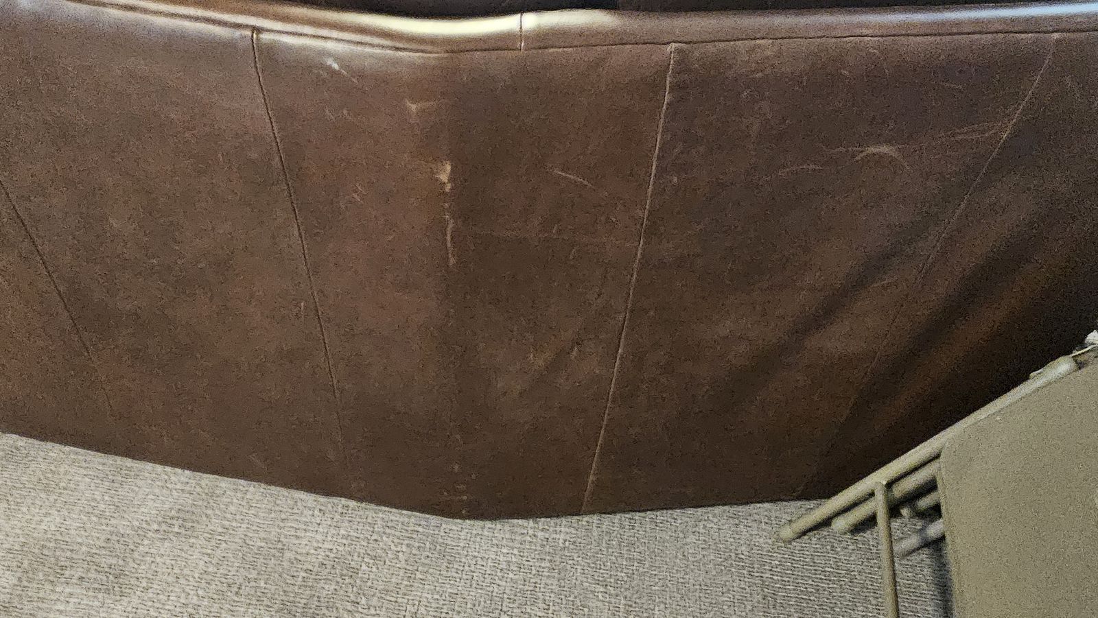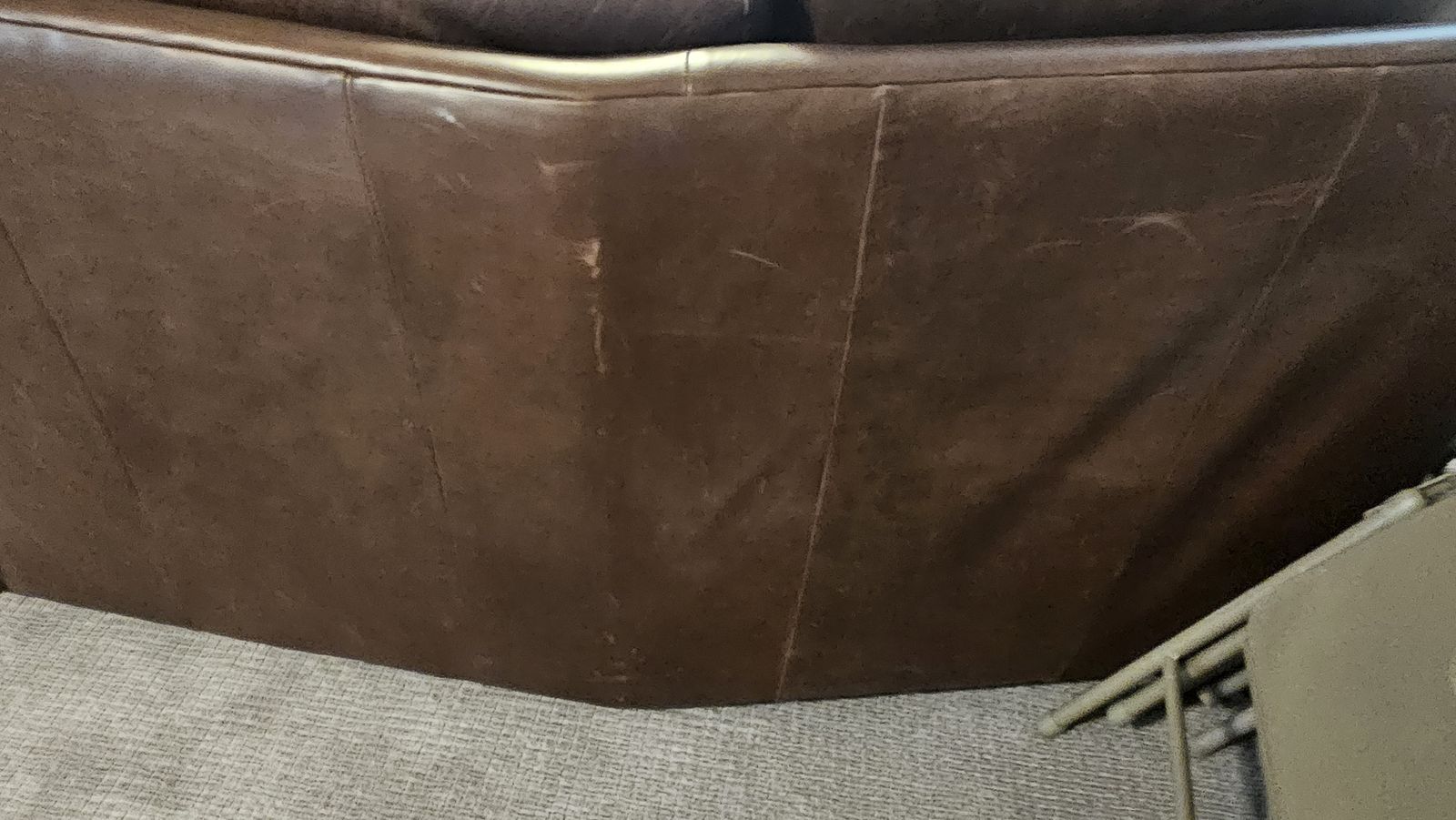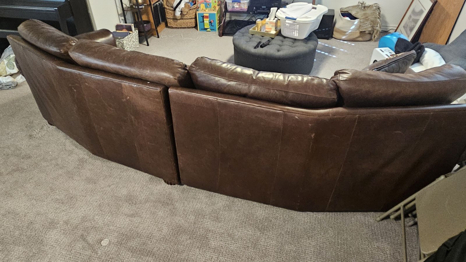 ZelleCustom-made curved leather sofa. This was manufactured in the High Point furniture district, American-made. The cushions are in great shape - it just needs leather treatment to bring it back to life.