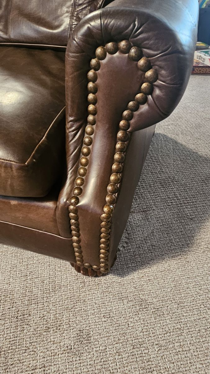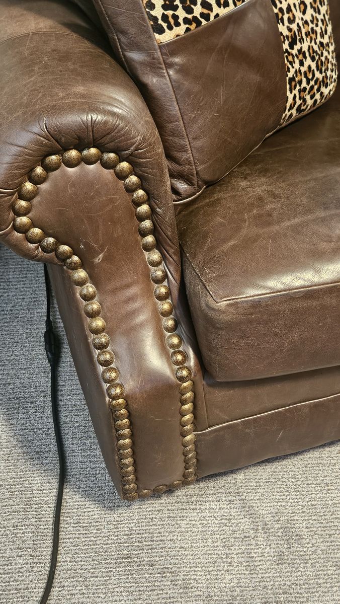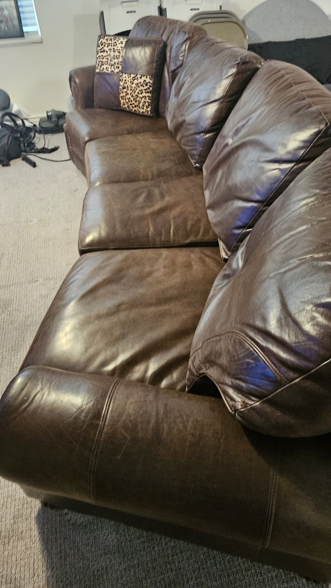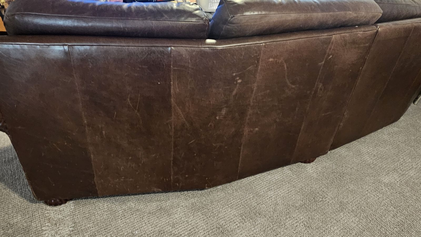ZelleCustom-made curved leather sofa. This was manufactured in the High Point furniture district, American-made. The cushions are in great shape - it just needs leather treatment to bring it back to life.