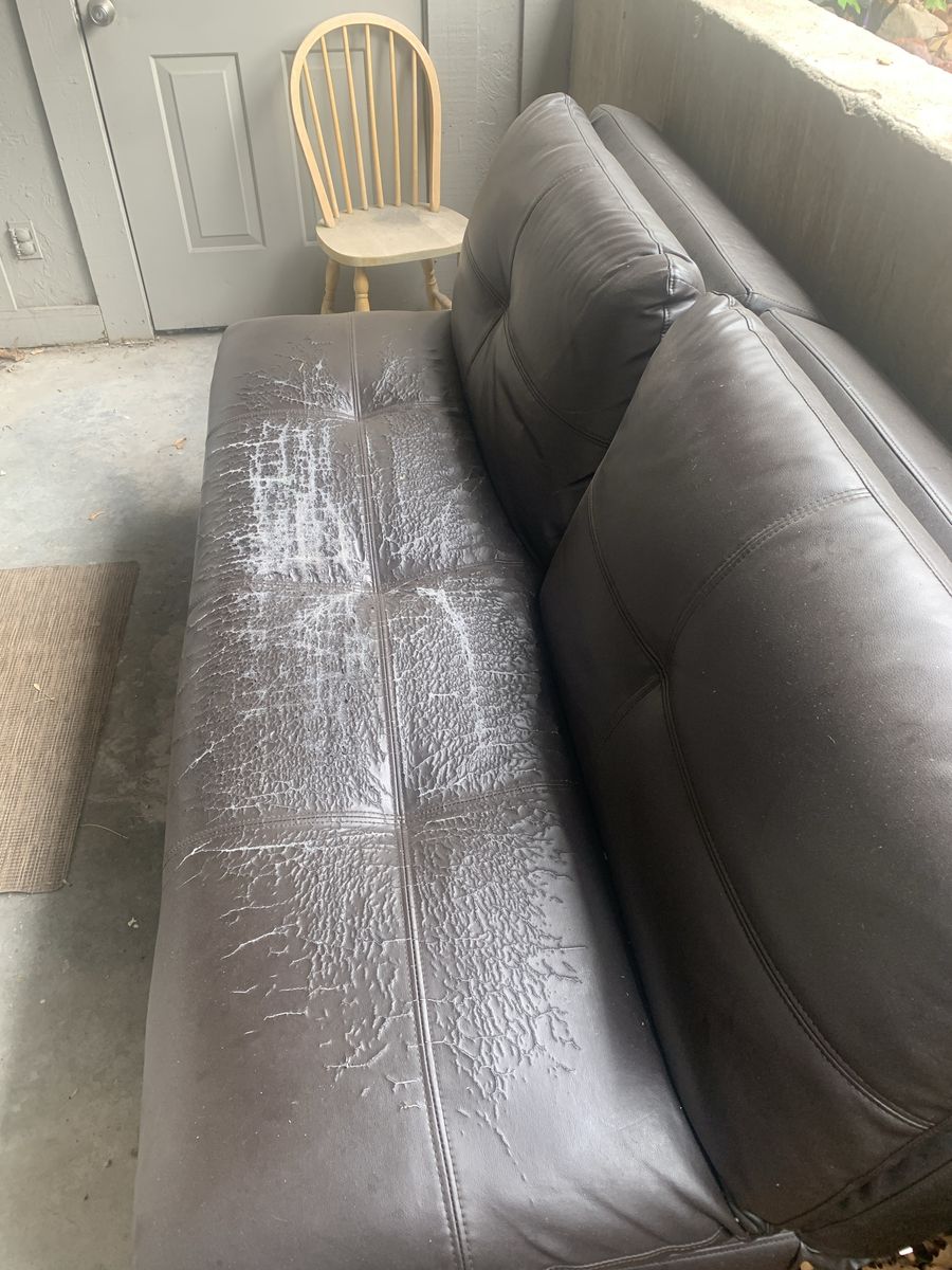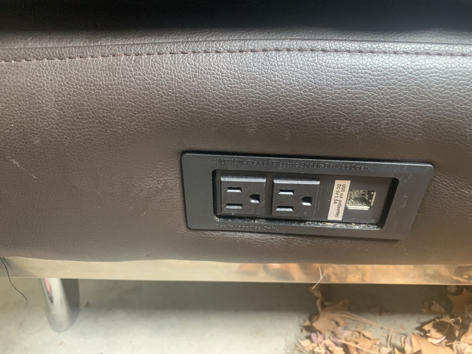 Well loved futon originally purchased from Costco. Includes working power strip. Leather is well worn from dog paws. Comfortable, just worn Adjustable back works; no issues Free for pickup