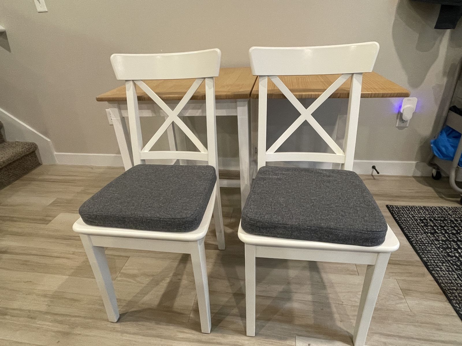 VenmoSmall table, can fold out to make it fit 4 people. Also come with two white chairs with cushions.