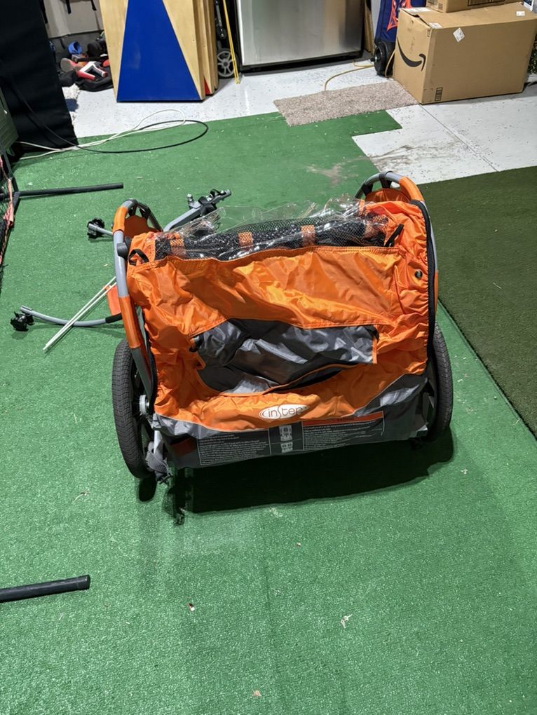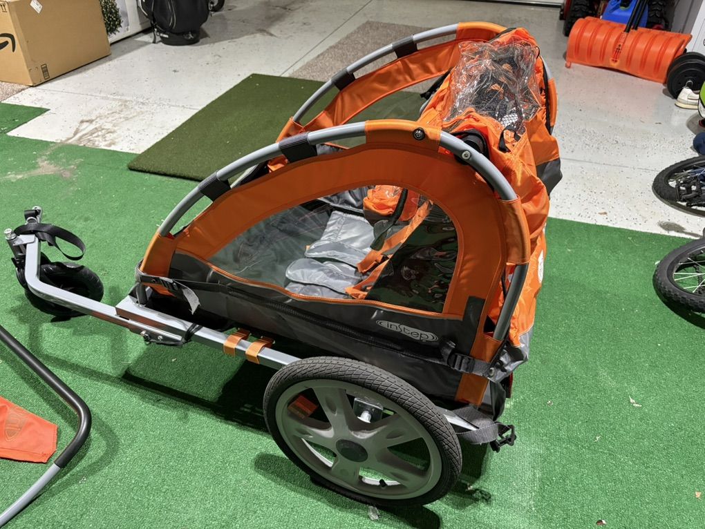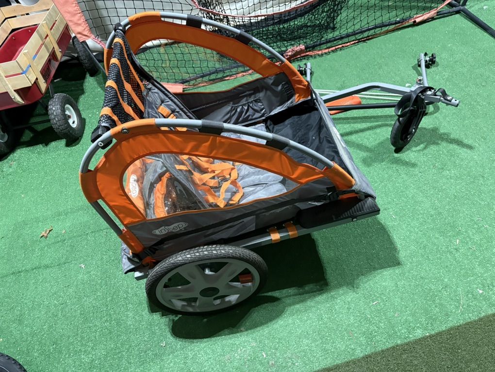 2 kid bike trailer/stroller. Handle and front wheel attachable/removable to become stroller. Bike hitch attachment for connection to bike. 2 kid 5-point harness seatbelts for safe ride. Mesh or plastic rain cover. Cash or Venmo, pickup in Hyrum. Text is easiest, thanks!