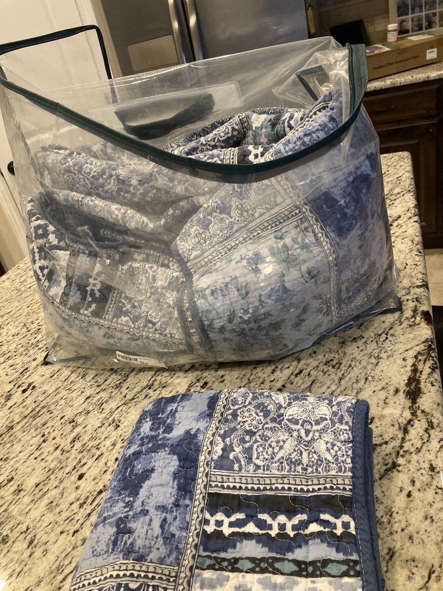 Never used high quality LIGHT BLUE JC PENNY bedding for Queen size bed. Not matching our decor. Call or text anytime West Layton.