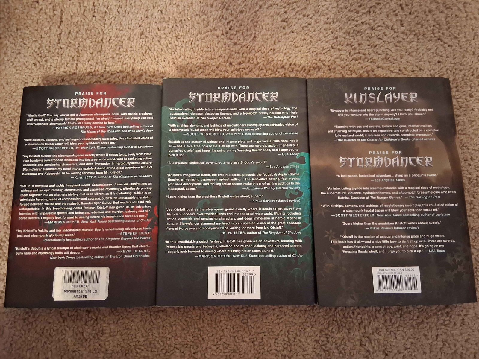 Venmo$10 total for the full Japanese steampunk series by Jay Kristoff~! The book covers are worn, you can tell a bit by the photos. There is also a name written in the covers. But the books are otherwise in good condition! No torn or scribbled pages! :)