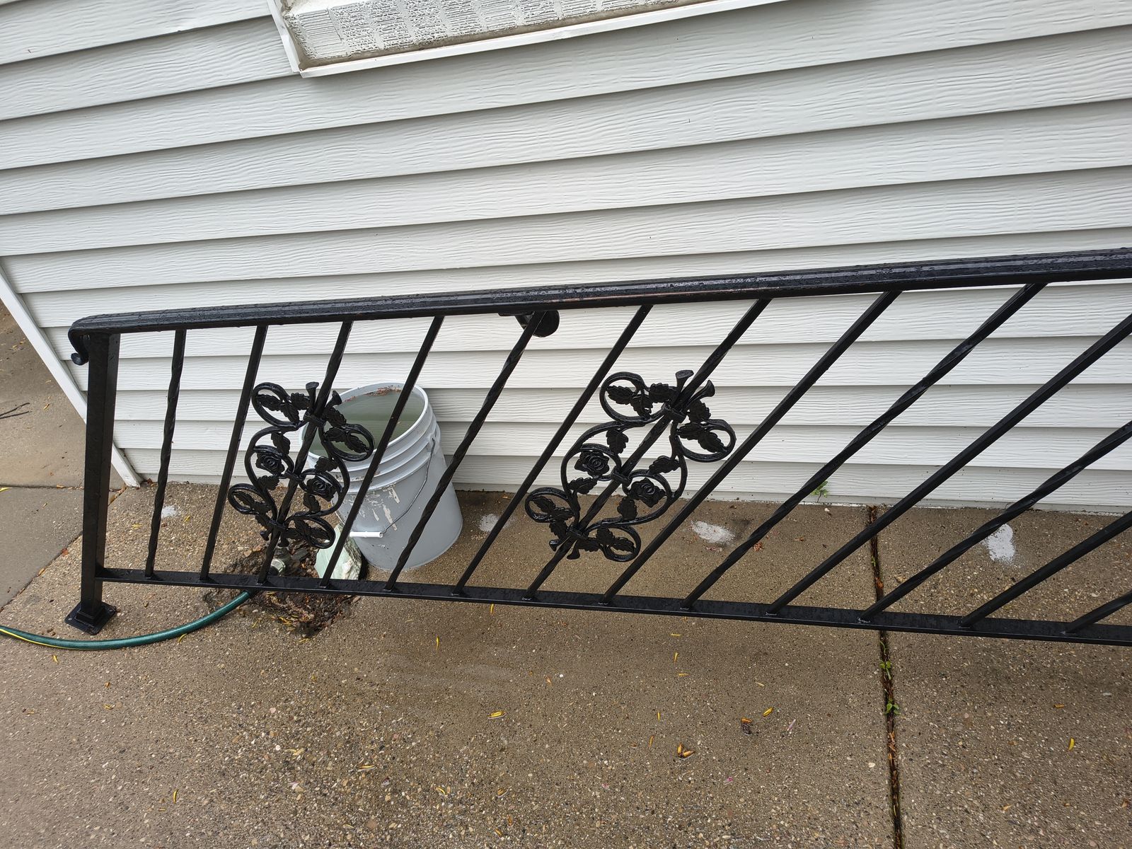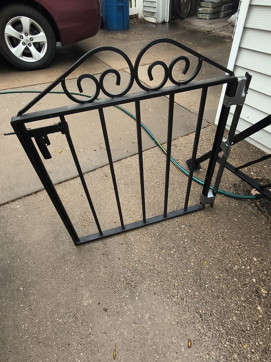 Iron stair railing with gate. The measurement for the railing is approximately 9 feet long by 33 inches tall and gate is 27.5 inches wide by 33 tall.