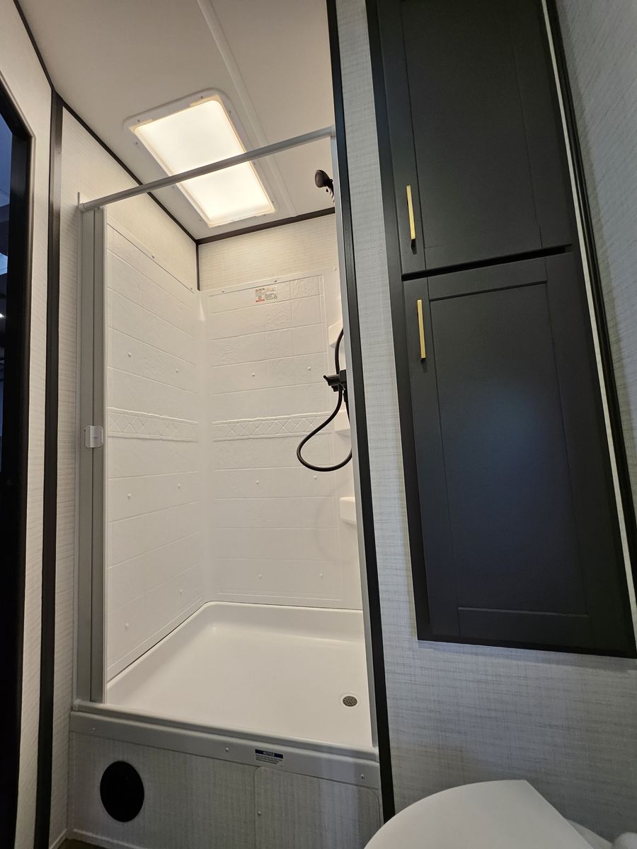 Kitchen with Full Size 12V Fridge, Microwave, 3 Burner Cooktop, and Large Sink!