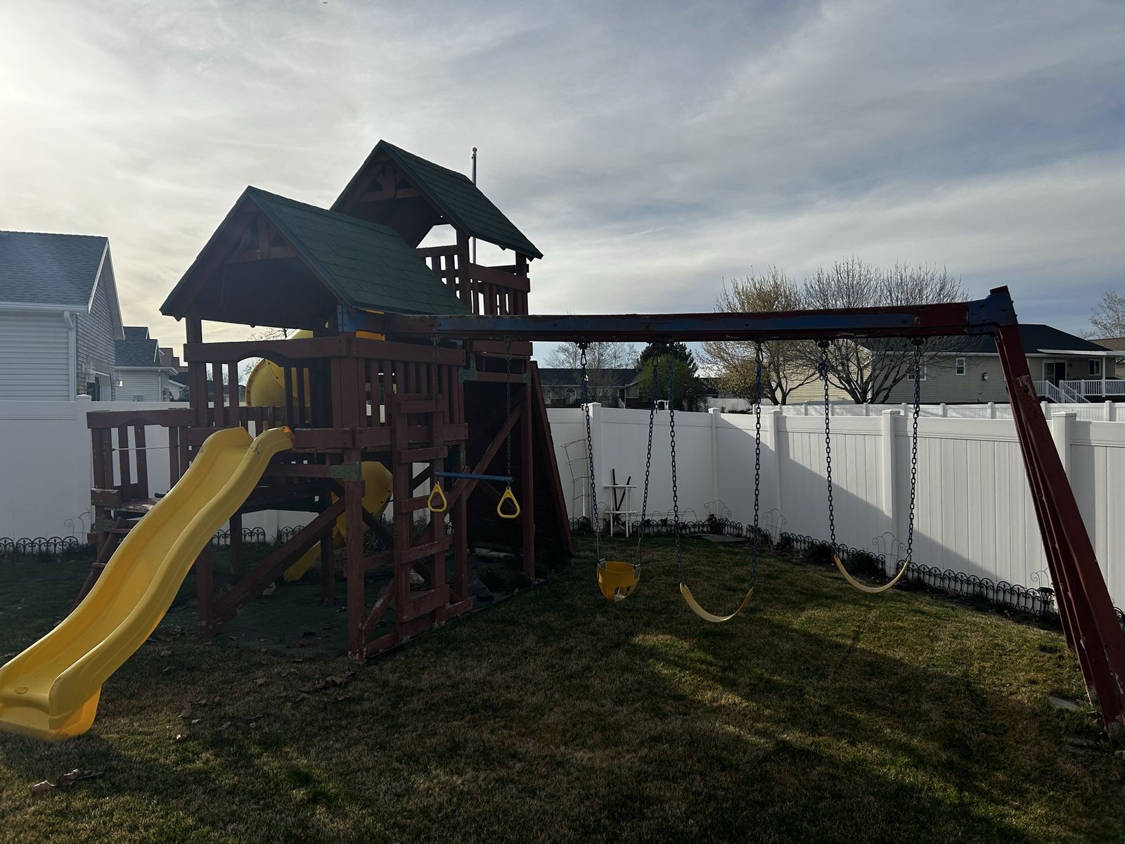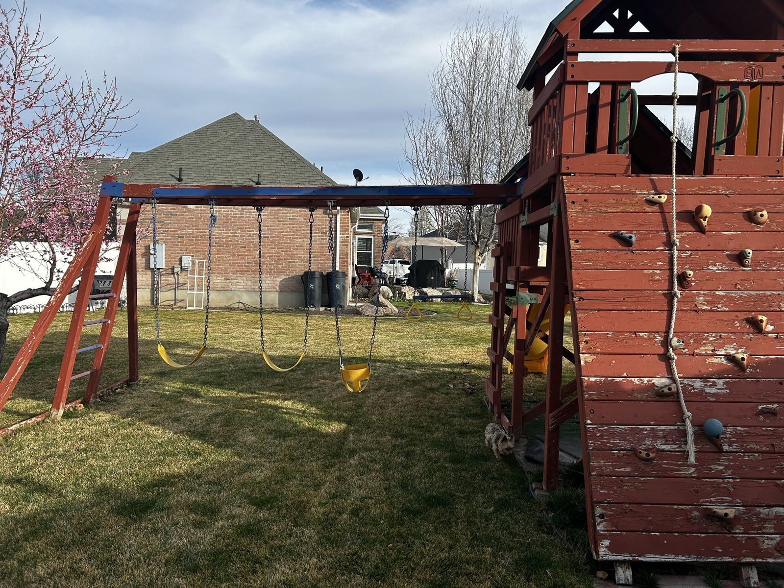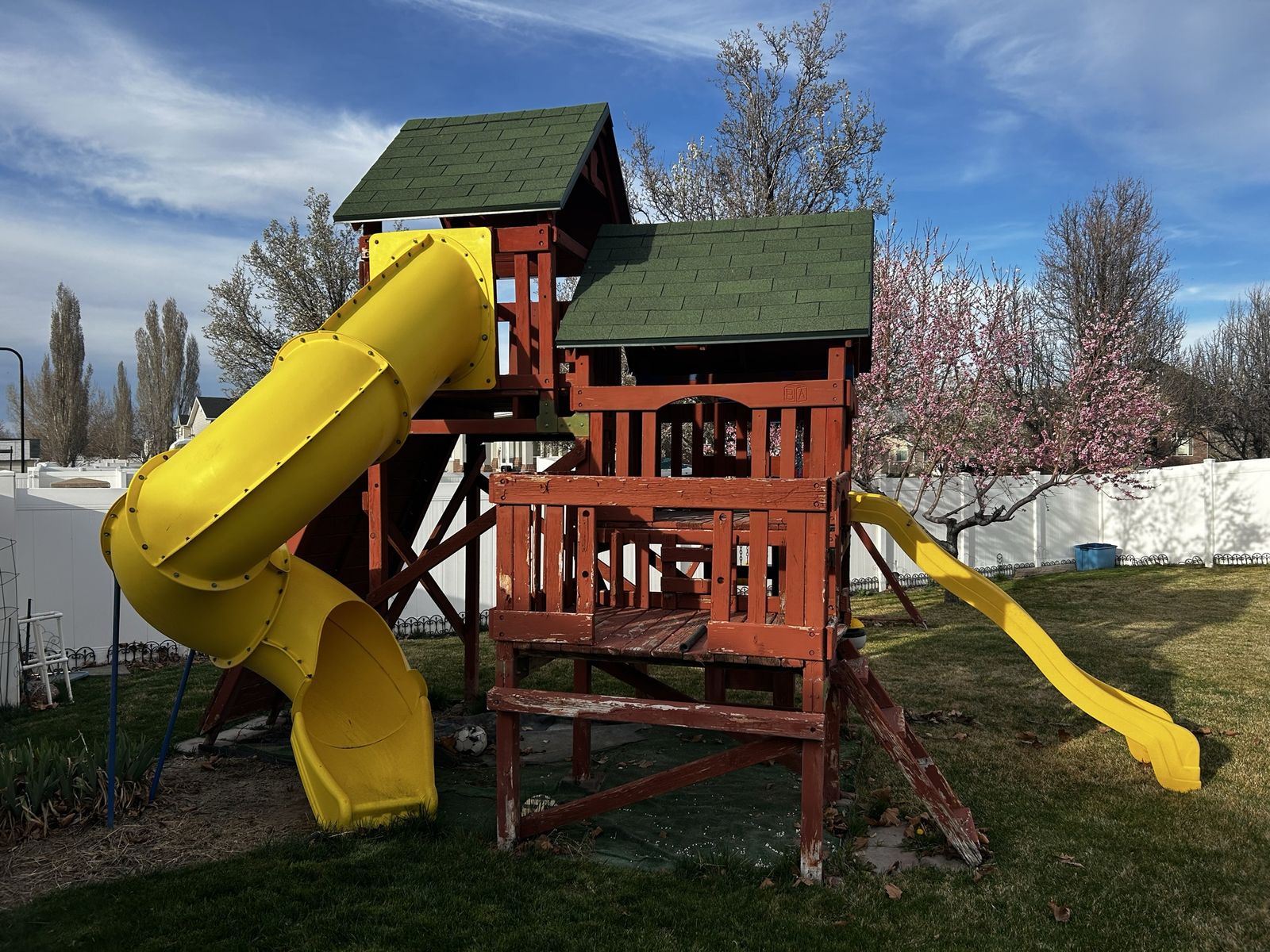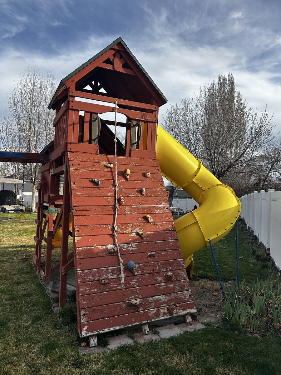 Free!!! Huge sturdy wooden swingset with 2 slides, large climbing wall and 4 swings. It definitely needs some updating, replace some wood boards and maintenance. It will take some work to dismantle and move it. The main towers are in very good shape. Our kids are now grown so ready to get rid of it.