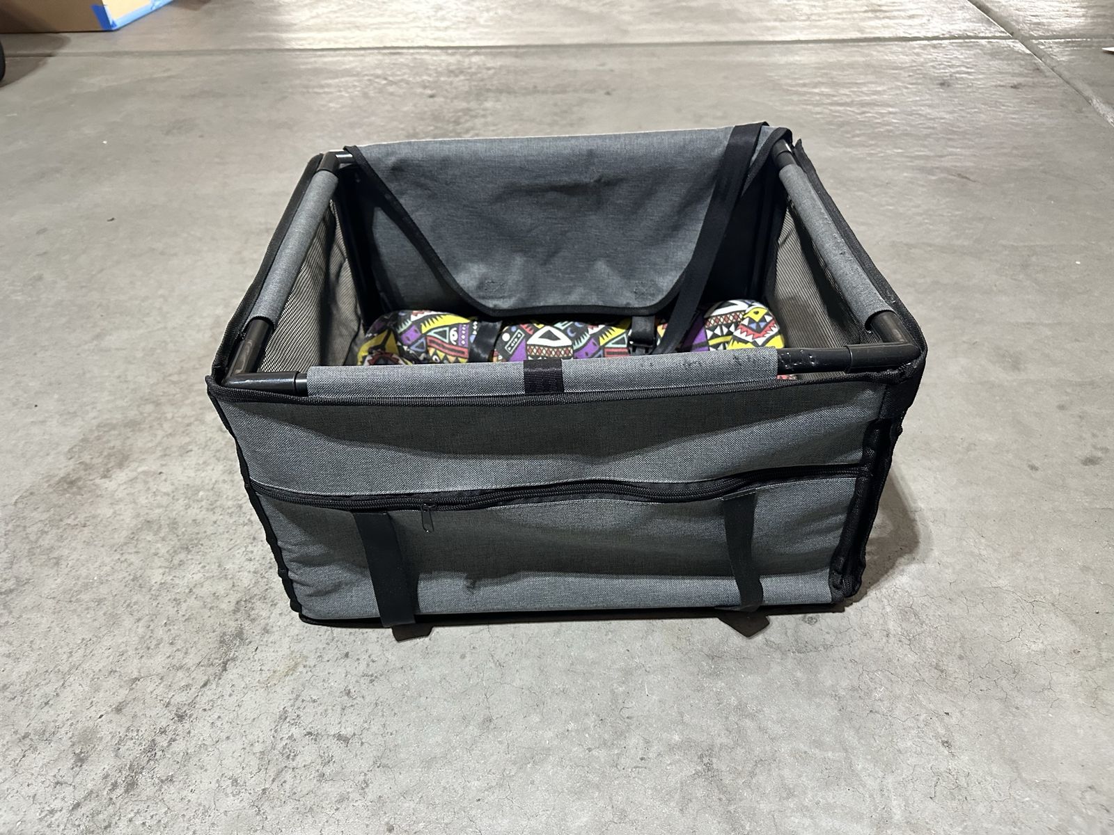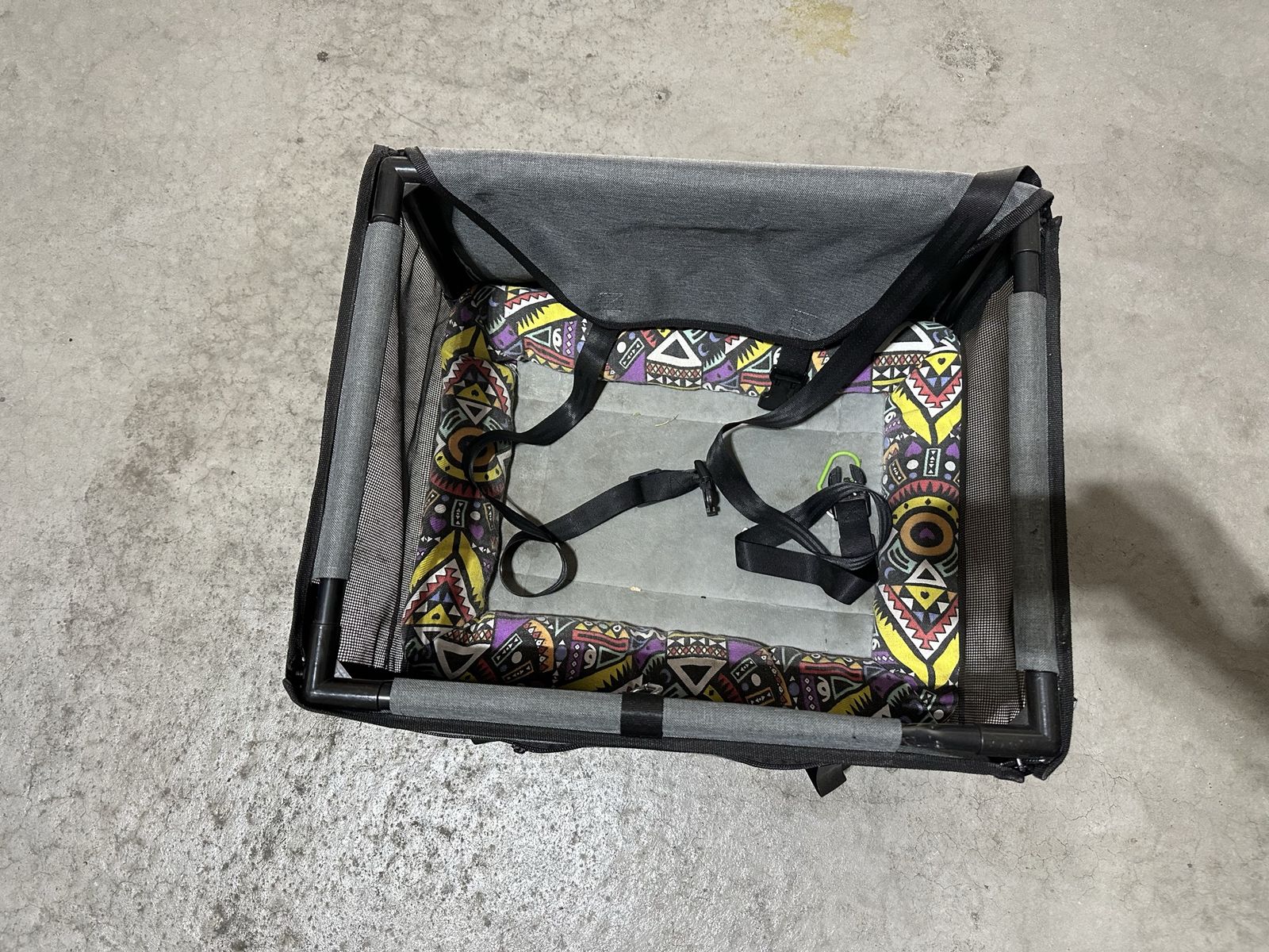 VenmoStrap in with seatbelt or latches and hook for collar to keep medium to small dog in while driving.