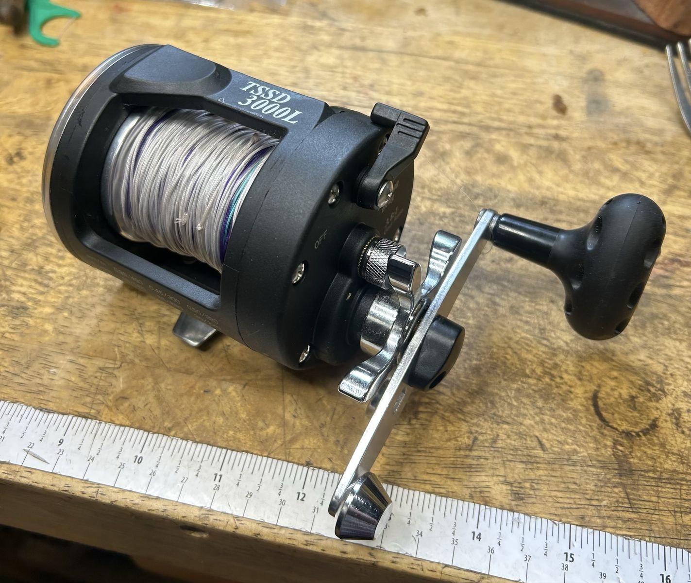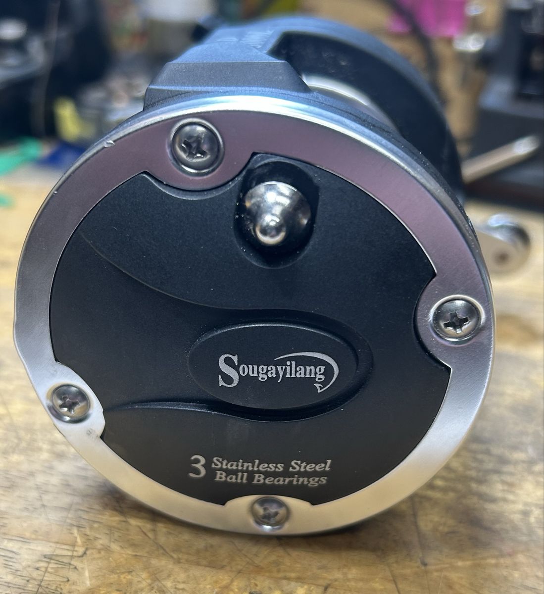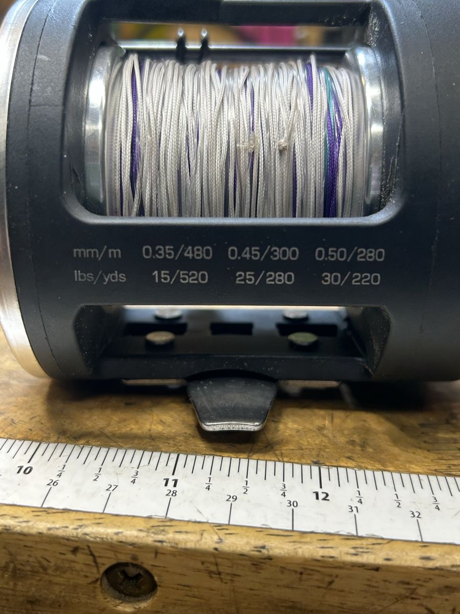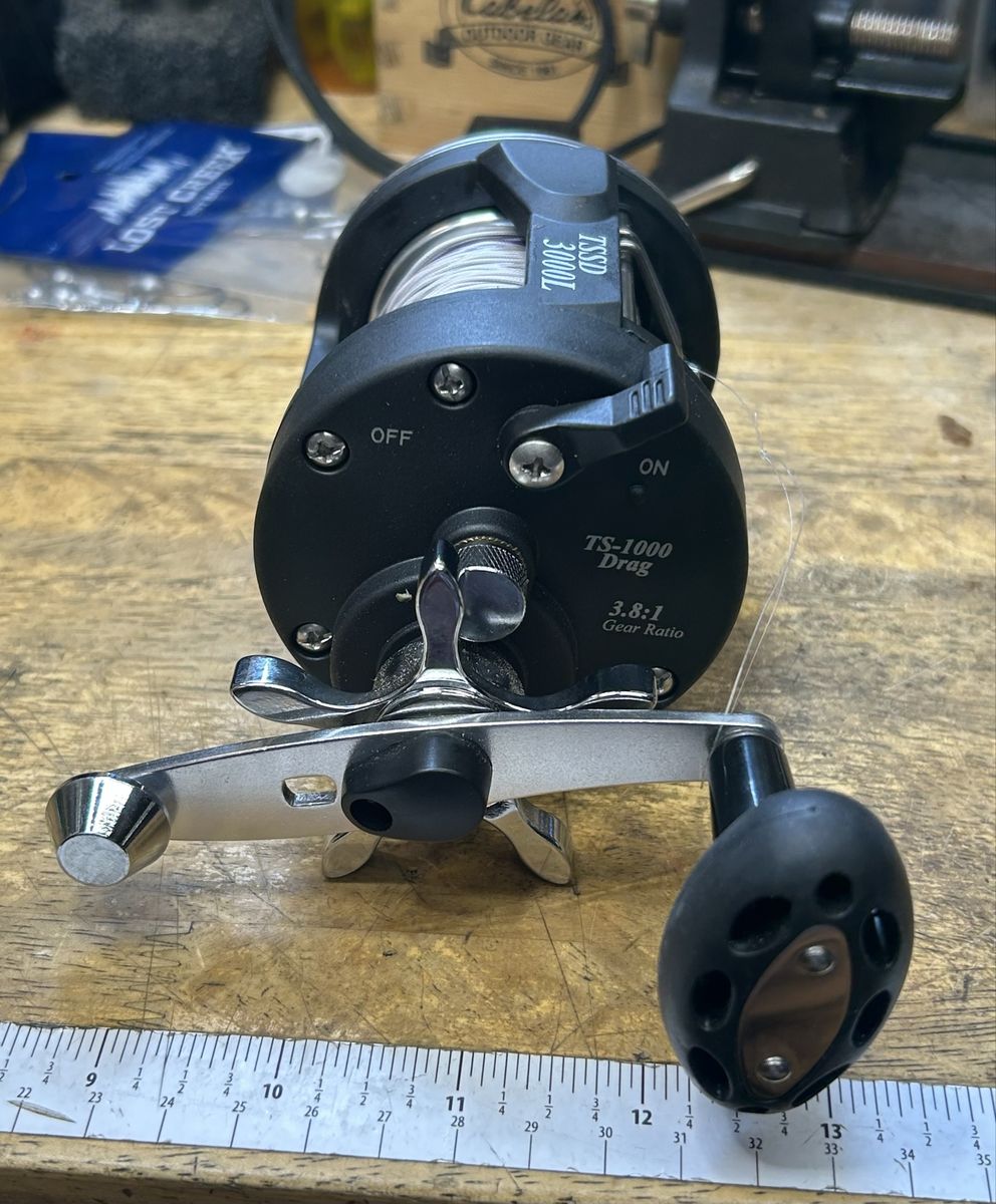 ZelleSougayilang TSSD 3000L level wind reel with 100 yd Suffix 27# Lead line, with leader attached. 3 Stainless Steel Ball Bearings. Star drag. 3.8:1 gear ratio. Excellent Condition Like New.