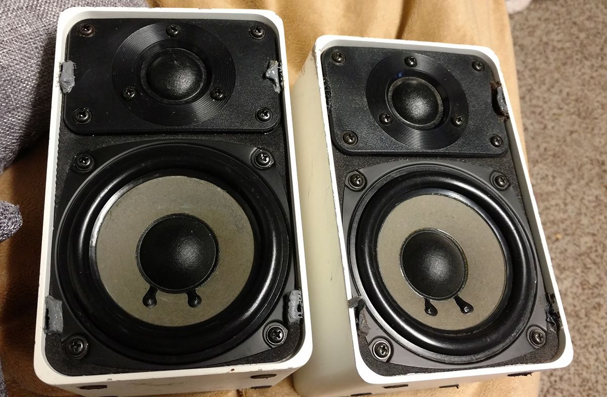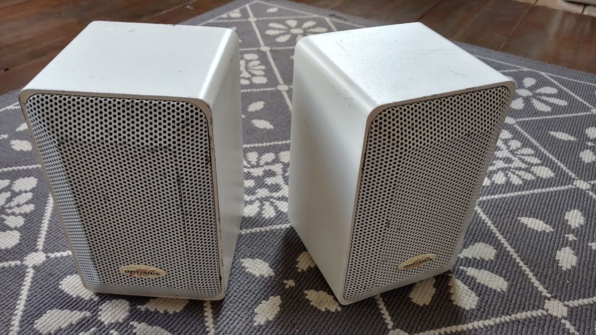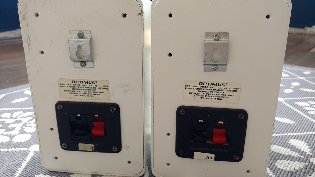 The Realistic Pro 7AV speakers were made from 1994-1998. They use the same components as the earlier Minimus 7 speakers, with a cast aluminum enclosure, long-throw 4" woofer, and 1" soft dome tweeter. Equally at home with stereo listening in small spaces, ready for use as easily concealable surround sound speakers, or up to the task of providing ambiance outdoors. They come with keyhole wall mounts on the back, and are also threaded for many other styles of mounting. Frequency response is 120 Hz - 20 kHz and recommended power is 40 watts RMS or 80 watts max. This pair work great and sound quite good for their diminutive size. The white painted exteriors have a few scuffs, but nothing that changes the way they function.